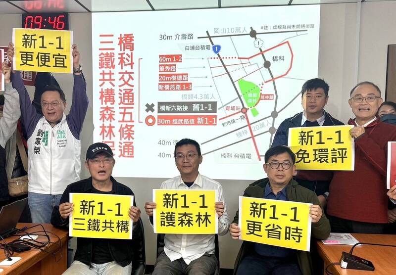 森林城市協會理事長莊傑任、橋仔頭文史協會榮譽理事長蔣耀賢、高雄市綠色協會理事長黃景南等人,今天於市議會舉辦「橋科新1-1道路快又好,三鐵共構森林保」記者會,市議員黃柏霖、民眾黨高市黨部主委劉家榮等人出席聲援。