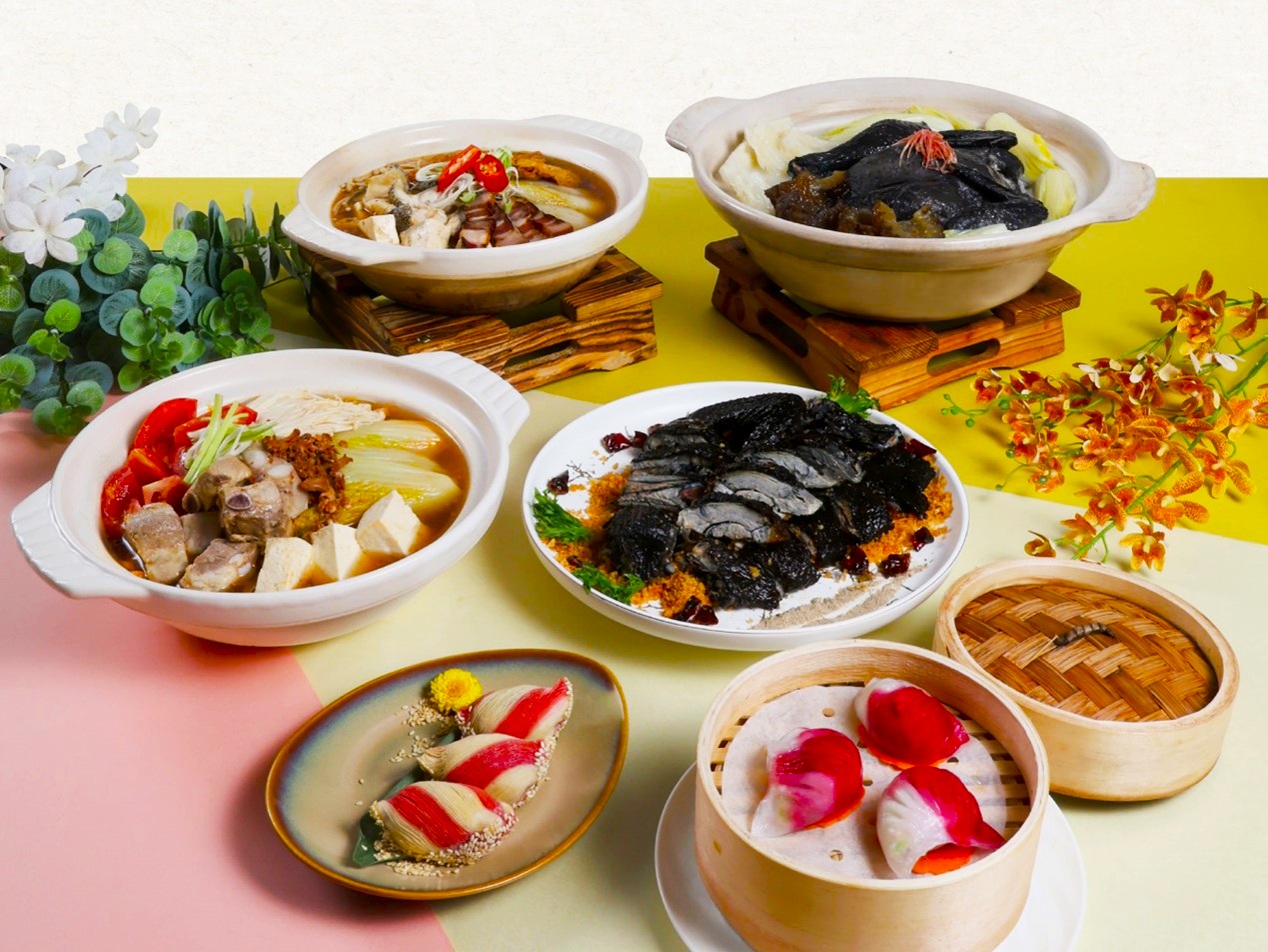 明宮粵菜廳則以「粵宴春藏・明宮煲藝」為題,展現粵式火候與養生精神。三款溫補煲湯各具特色:紅柿排骨鍋酸香開胃,沙茶魚球鍋滋味濃郁,花膠海參燉烏雞則以港式奶白湯底融合多重食材,滋補養身。熱菜香酥脆皮烏骨雞外皮金黃酥脆、肉質鮮嫩,搭配蒜酥更添香氣;點心鱈魚餃與海螺酥則以精巧造型與細緻口感,為餐桌增添驚喜。