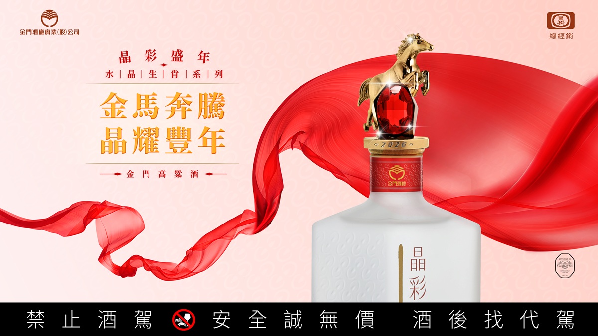 呼應2026火馬年的能量意象,「晶彩盛年金門高粱酒(馬年款)」特別選用光芒四射、耀眼奪目的施華洛世奇 (Swarovski) 火橙色巨型水晶,紅橙水晶為主火,增強生命力與人際關係,帶來熱情和貴人運,施華洛世奇的特製巨型火橙水晶,每個精密的切割面於光影流轉間,可見到所呈現出來的光澤閃耀,猶如在點亮新年的希望之光,讓好的運勢可循光而來;金色,總是帶來財富與尊貴的感受,而金馬所象徵的是事業發展、財運奔騰與滿載而歸,瓶首立體刻劃的金色駿馬以昂首奔騰之姿,展現澎湃的生命動感,意象上彷彿在將過去的阻礙、不快一併甩於身後,朝向前方無限的可能盡情奔馳;「晶彩盛年金門高粱酒(馬年款)」運用金馬與紅橙水晶的雙結合,金馬飛躍於璀璨火橙水晶之上,結合著動態的衝勁與穩定的能量,猶如好運的層層疊加、讓祝願力道得以加乘,挾著來年事業紅火、馬到成功的正向能量,讓財運與福氣奔騰不息,象徵在新的一年為人們照亮前路、提振自信跨越來年的變動與挑戰,迎接嶄新的年度篇章。