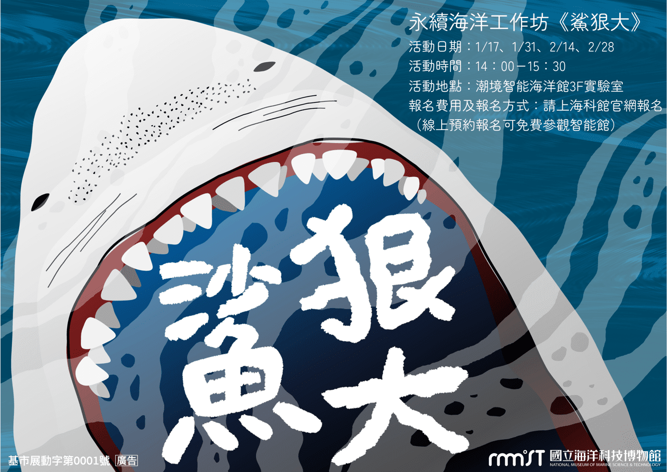 如果大家想要了解更多鯊魚不同的一面,或是對牠們充滿著好奇,歡迎大家來參加潮境智能海洋館的《鯊狠大?!》工作坊,預計於115年的1/17、1/31、2/14、2/28,共四個梯次,帶您認識鯊魚、比較鯊魚和其他海洋生物的不同之處。歡迎於海科館的活動報名頁面https://nmmst.fonticket.com/ticket/QwWN8XOVjlamnBeE線上報名參與,同時可以參觀潮境智能海洋館,歡迎親子共學。