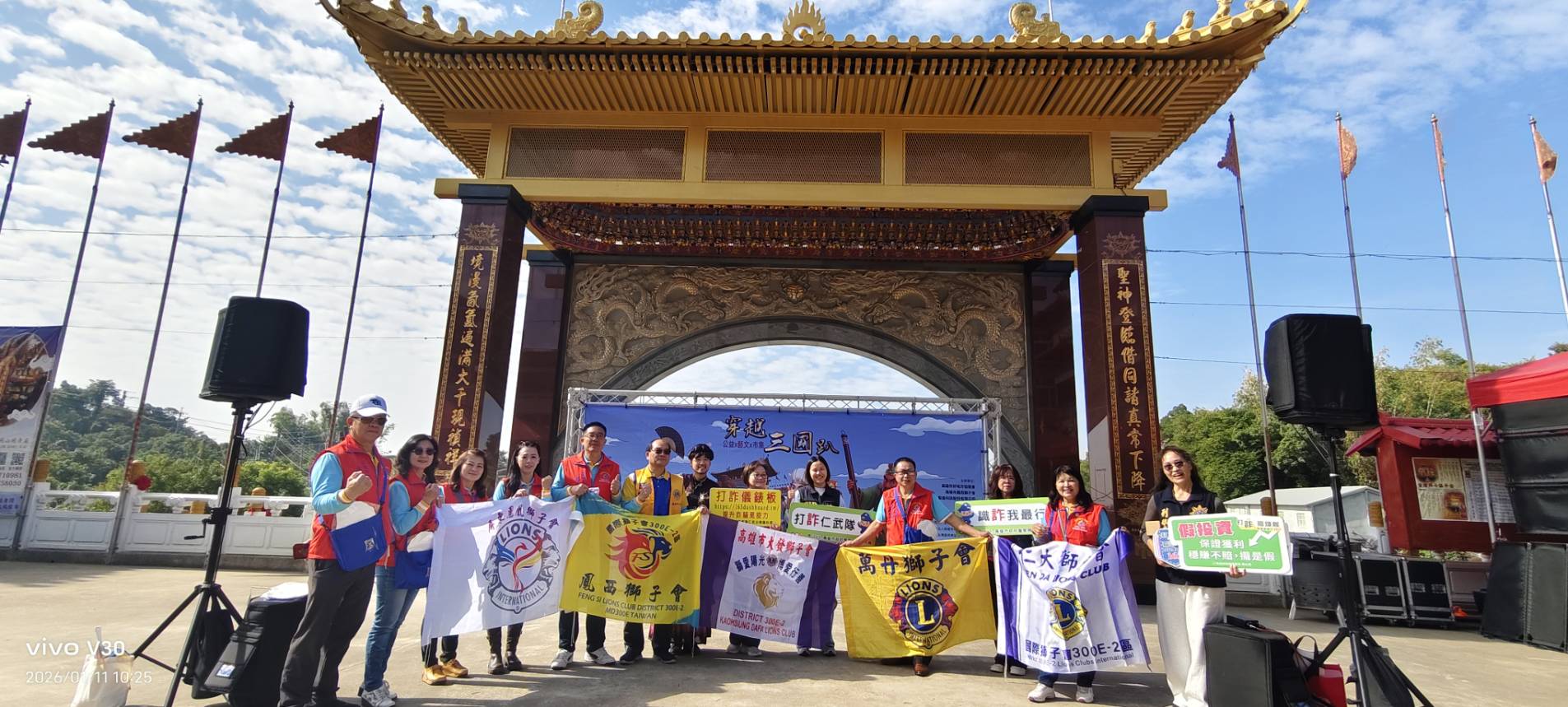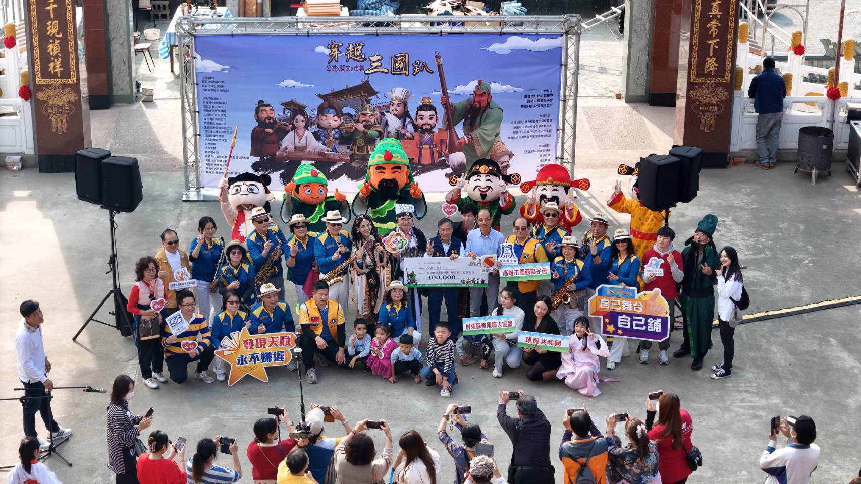 本次《穿越三國趴踢》公益活動於高雄東照山關帝廟登場,由高雄市好地方協進會、高雄市鳳西獅子會與聖皇科技股份有限公司共同主辦,並獲多家企業與團體協力支持。活動以「三國穿越」為主題,將歷史文化元素融入公益市集,現場超過40個愛心義賣攤位一字排開,涵蓋美食、手作與文創商品,讓民眾在輕鬆參與中付出善意。