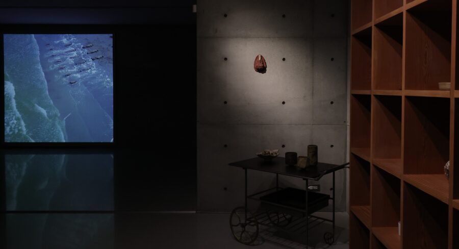 劉濬磊擅長跨越影像、裝置、行為與土地媒材的多重語言,他的創作,始於一種「想要靠近世界的焦慮感」,也是一種自我的探索過程,他也提到,這次展出的作品主題為「一界」主要是探討「何謂人」從形象的遮蔽到自我的探問;因為本身有閱讀障礙的問題,因此自幼習慣用觀察取代語言,因此在這次展出的作品中,可以看到他以身體與行動成為對世界發聲的方式。從一樓入口處的作品以紅紙覆面的剃度儀式,到透過集結眼睛的活動的畫面,呈現對生活的觀察,二樓的影像呈現上,則是在新竹的海邊拍攝完成,以1:1等比例的沙雕人形,隨著海邊層層疊疊的浪潮逐漸消失隱沒,除了意味著回歸自然的涵義也是他持續用作品探索人與人之間的關係距離、自我存在的邊界,以及精神性轉化的可能。