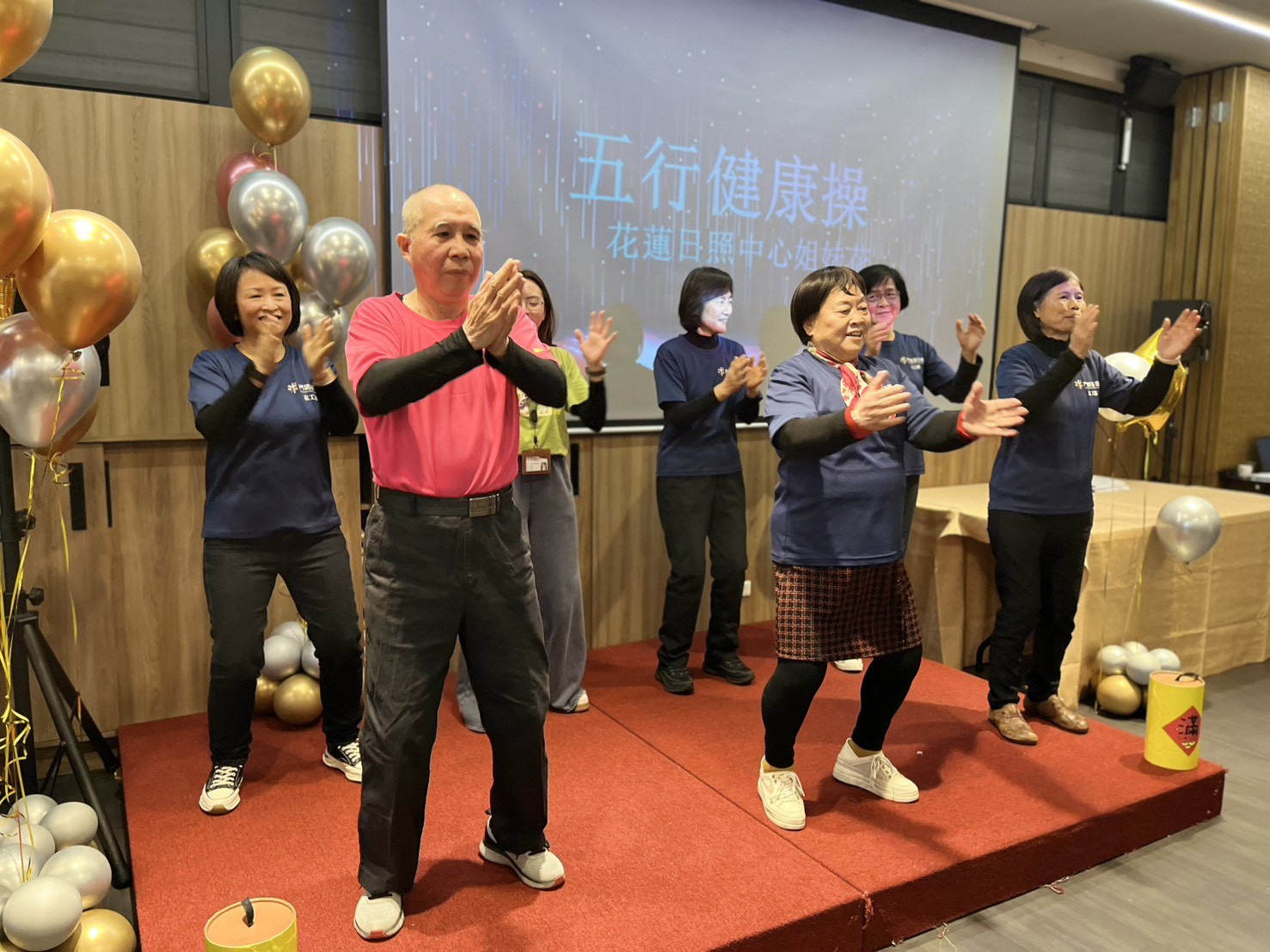 ▲花蓮日照中心姊妹們帶來五行健康操表演,菁英志工陳振賢也熱情參與。