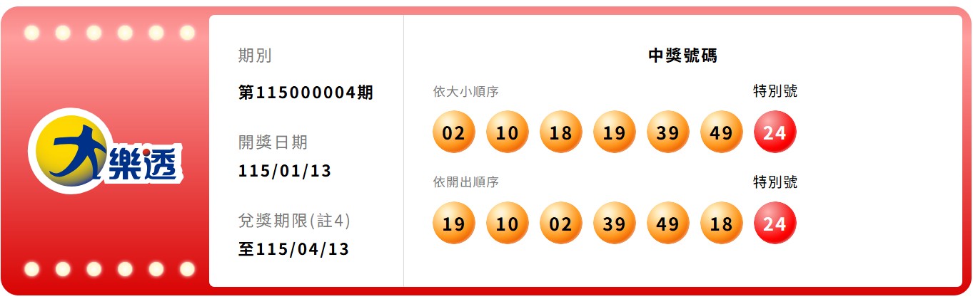 生活中心/綜合報導 台彩大樂透開出大獎!今(13)晚第115000004期獎號從小至大依序為:02、10、18、19、39、49,特別號24。最終派彩結果顯示,頭獎一注獨得,獎金為110,673,384,開出的彩券行是臺南市永康區崑山里永大路2段63號「猜衆電腦投注棧」。 ※大樂透獎號、派彩訊息依台彩公告為主。