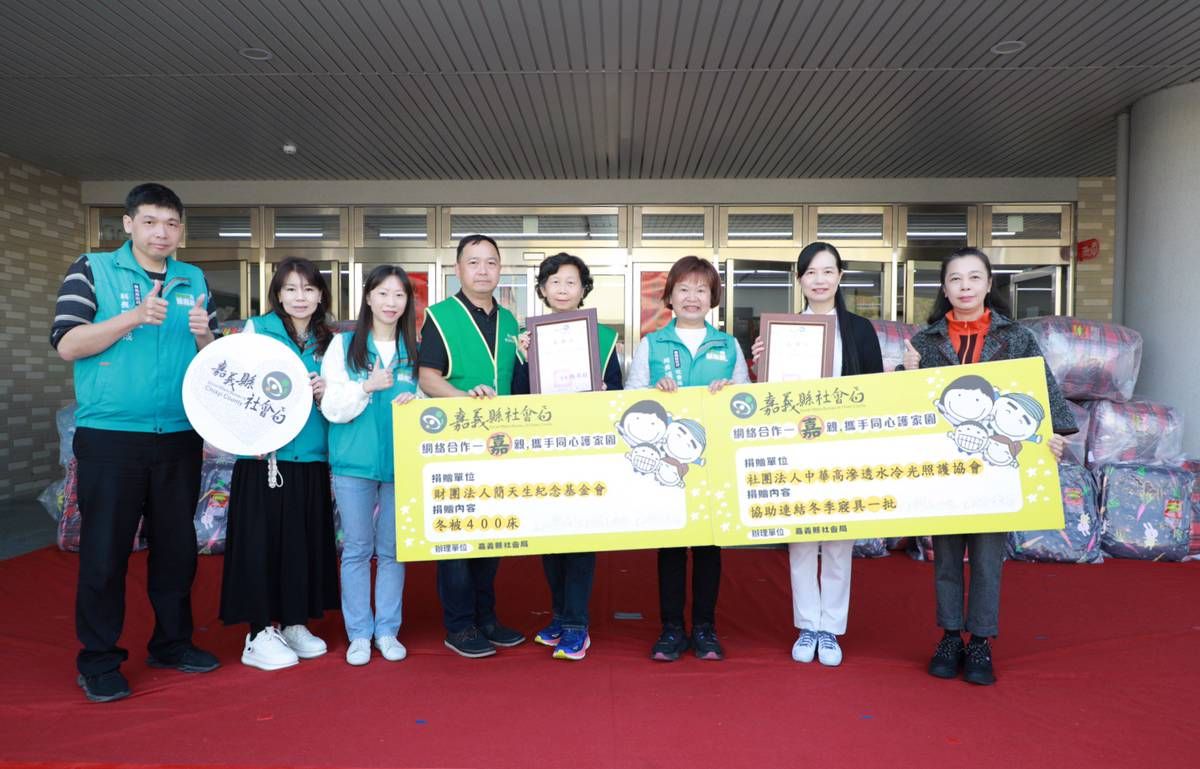 財團法人簡天生紀念基金會及社團法人中華高滲透水冷光照護協會,攜手捐贈嘉義縣社會局及社福團體冬被寢具400件,提供身心障礙團體、社福機構及弱勢家庭。社會局長張翠瑤代表縣長翁章梁接受並頒發感謝狀,感謝基金會及協會長期投入公益、關懷弱勢。