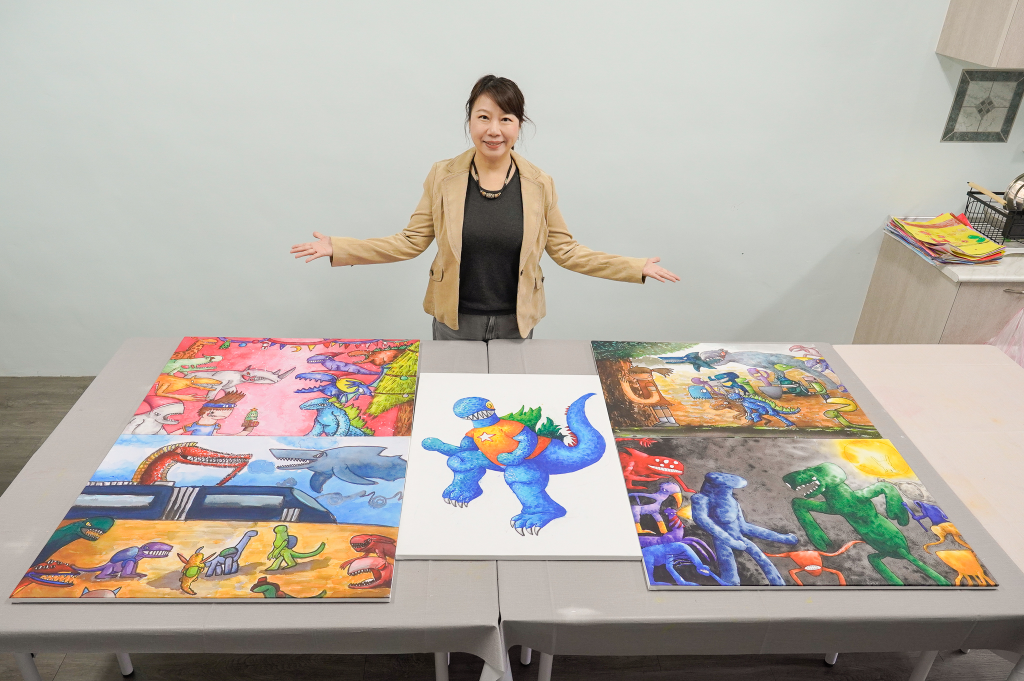 ▲郁昕的啟蒙老師希望共好發展協會理事長呂蓮華展示郁昕的各式恐龍畫作。(圖/新北市社會局 提供)