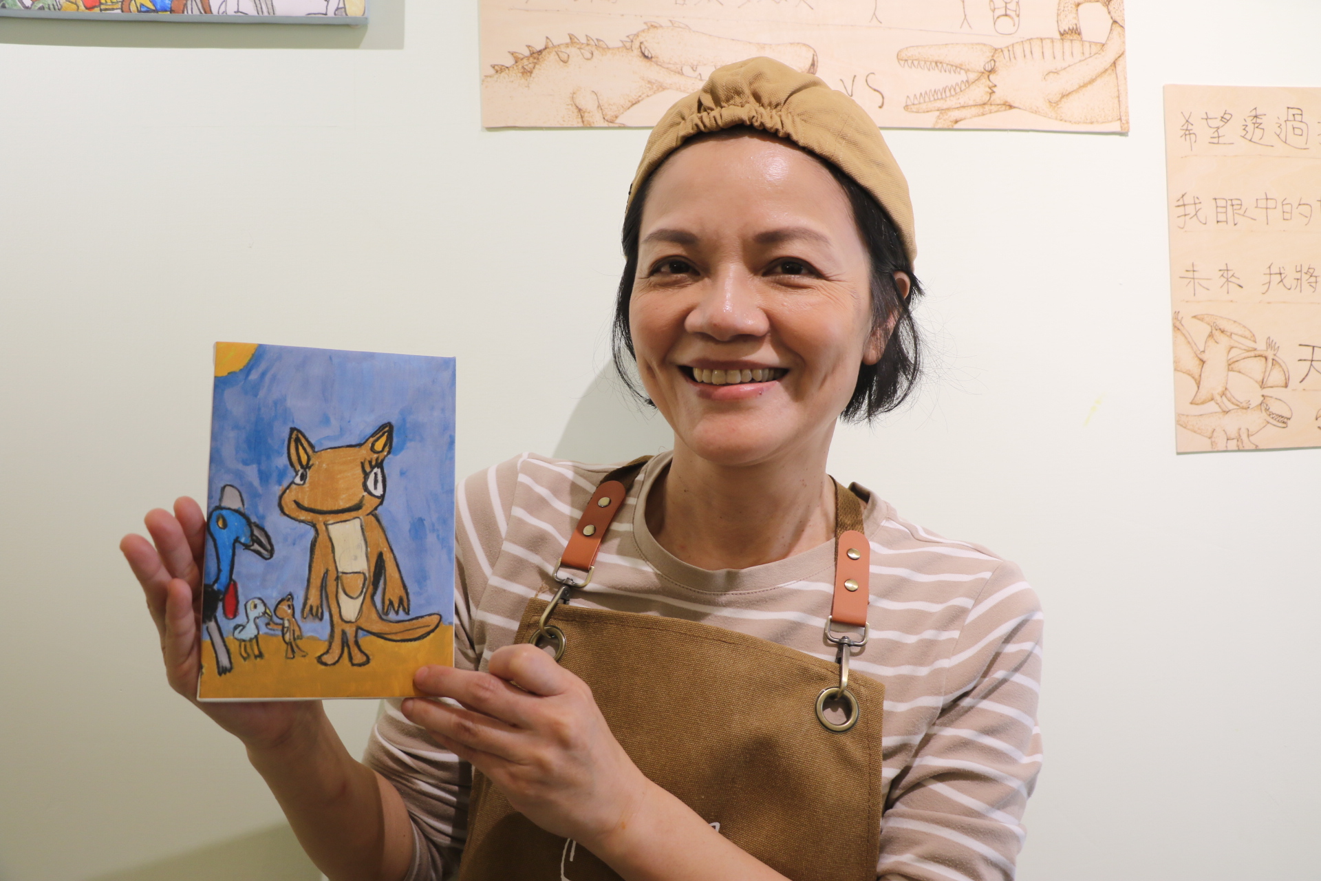 ▲郁昕的母親施惠萍說,別人都畫了頭髮捲捲的、漂亮的媽咪送給母親,但郁昕卻畫了袋鼠與鴕鳥。(圖/新北市社會局 提供)