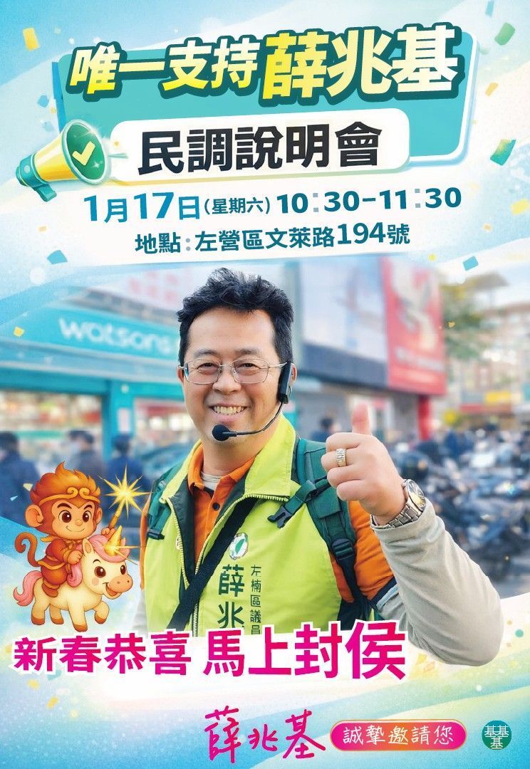 薛兆基民調說明會明天1/17(六)上午10:30~11:30,地點:左營區文萊路194號。