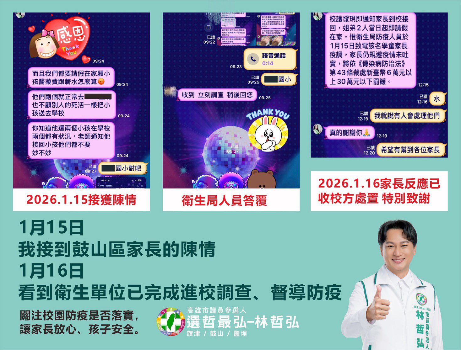 除官方處置外,地方也出現「陳情即刻處理」的案例。據了解,高雄市議員參選人林哲弘於1月15日接獲家長陳情,反映班級疑似群聚、家長憂心資訊落差。林哲弘表示,雖然尚未當選,但接獲求助後即協助彙整狀況,並立即聯繫衛生局與疾管相關單位,請求加速進校了解與處置,讓家長能盡快得到明確回應。