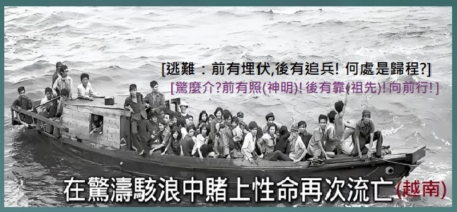 華人-14 越南(客家人)[逃難:前有埋伏,後有追兵! 何處是歸程?],[怕麼介?前有照(神明:三山國王令旗)! 後有靠(祖先:阿公婆神祖牌)!向前行!],客家人命逢流亡真( 才過),但當有(才情)又有(才調tiau),事過境遷,過去苦 難中,現下發展成企業大頭家&國家大人物介也當多!