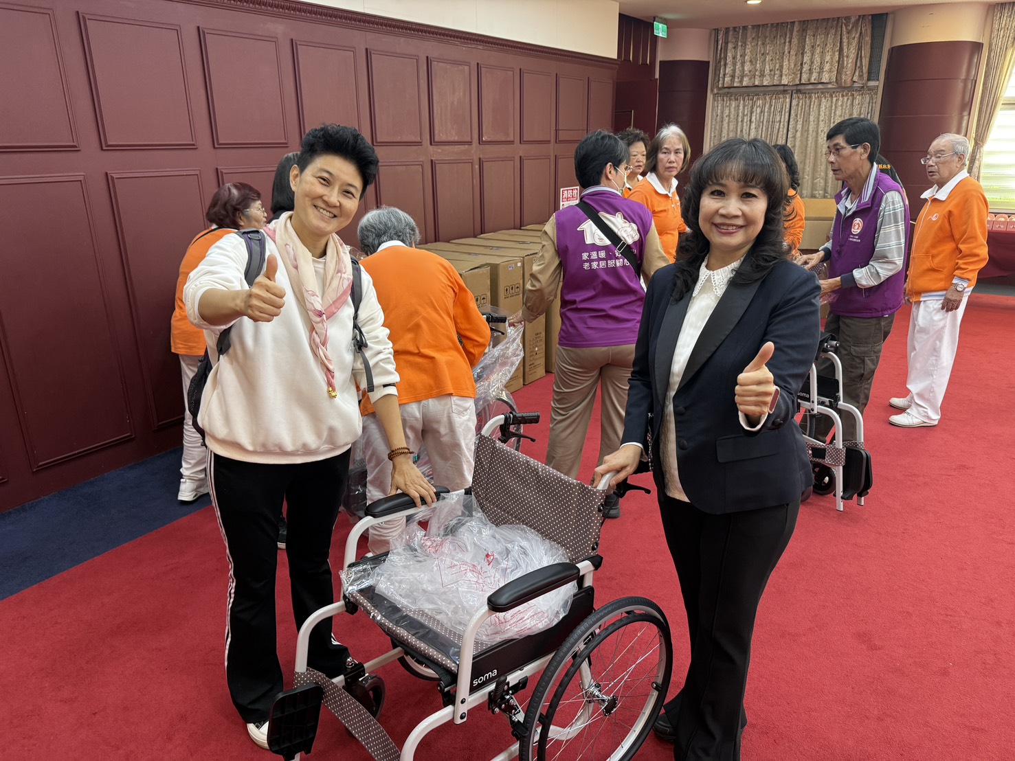 ▲㵾光文化藝術基金會榮譽董事長韓林梅(右)等人致贈大批輪椅。