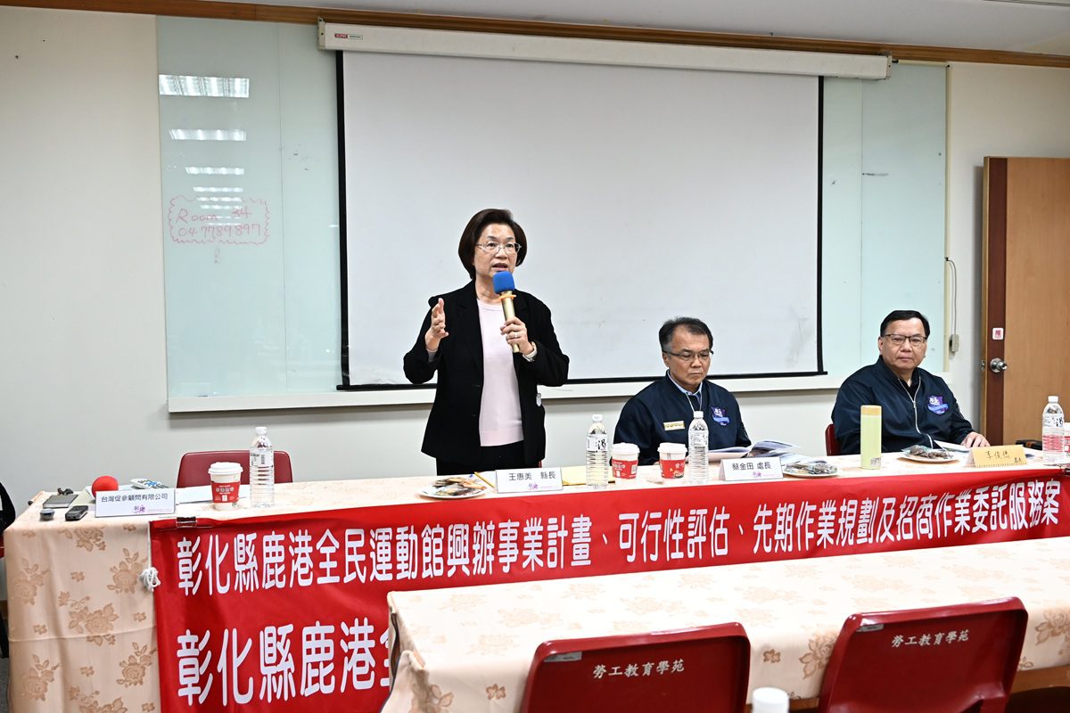 縣長王惠美表示,今日說明會為「鹿港全民運動館」招商計畫。縣府目標於縣內八大生活圈各設立1座國民運動中心,和美館預計於今年3月啟用,鹿港館工程進度已超前,可望提前完工服務鄉親。鹿港館具備極佳市場潛力,鹿港鎮內約8萬人口,相鄰的福興鄉有約4萬人口,且緊鄰台61線西濱快速道路,交通路網涵蓋呈輻射往外,且擁有彰濱工業區龐大的勞工與就業市場。縣府雖初步評估10年可創造約2.6億元的產值,但鹿港館周邊坐擁12萬人口基數及彰濱工業區龐大的就業人口,發展潛力遠不止於此。今日與會都是專業經營者,未來也可能成為縣府的合作夥伴,非常歡迎大家提出寶貴意見,縣府會將好的建言納入標案需求。本案絕對沒有預設立場,將採公平、公正、公開的原則辦理,誠摯邀請專業團隊參與,共同開創營運佳績。