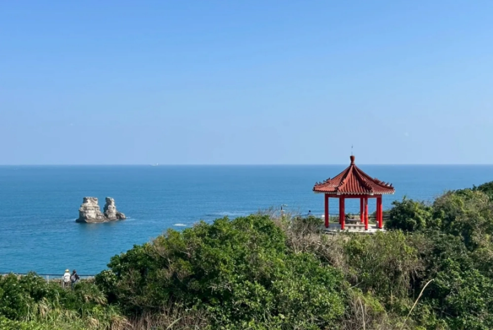 走到制高點的觀景平台時,視線自然會被海面上的燭台雙嶼吸引。這對並立在海中的岩石,是金山相當具代表性的自然景觀,也是不少遊客拍照留念的重點。步道沿途有涼亭遮蔽,加上海風吹拂,即使夏天造訪也不會太悶熱,很適合輕鬆走走、慢慢看海。
