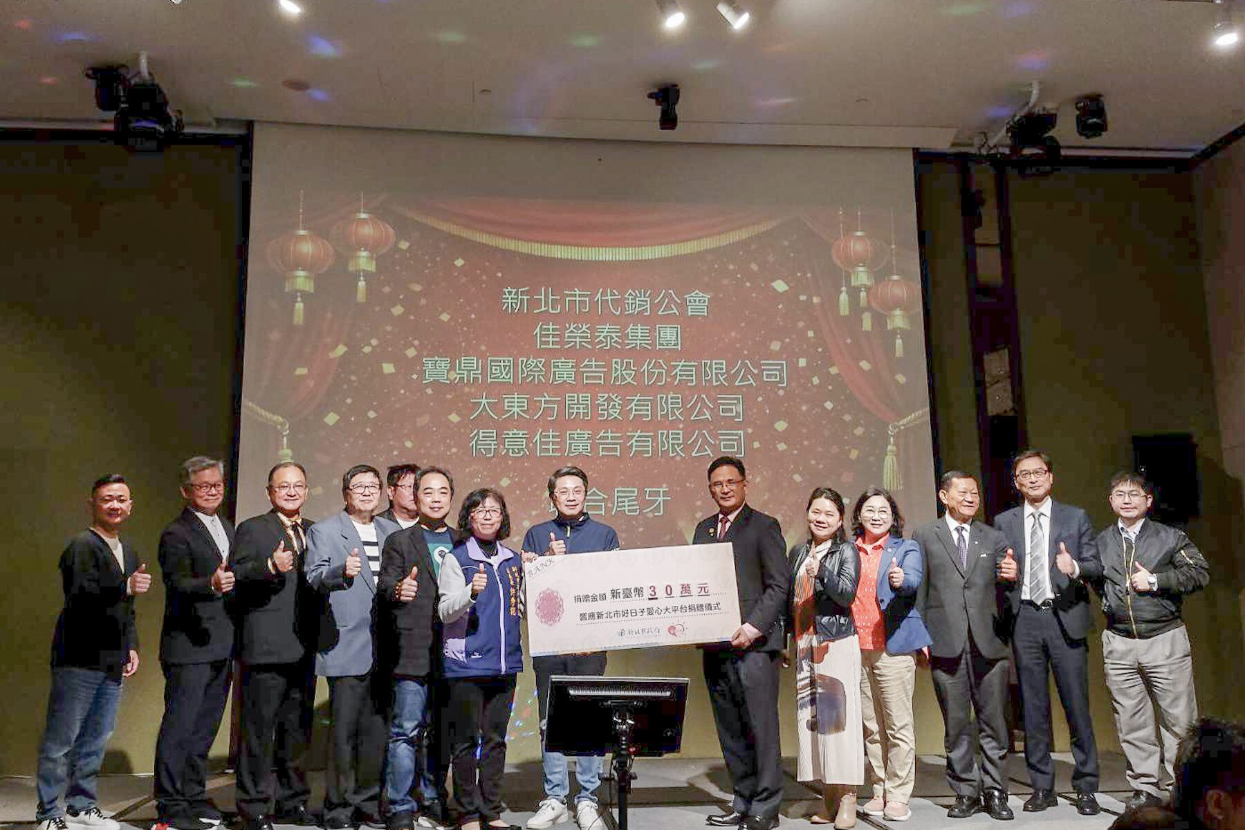 新北市不動產代銷經紀商業同業公會日前在新板希爾頓酒店舉辦2026聯合尾牙,會中特別響應新北市好日子愛心大平台,由不動產公會捐贈30萬元,另佳榮泰廣告公司也贊助10萬元,合計40萬元善款支持「新北市家外安置兒少支持服務計畫」。社會局副局長許秀能和地政局長汪禮國到場受贈,並代表侯友宜市長回贈感謝牌,向公會及企業表達最誠摯的謝意。