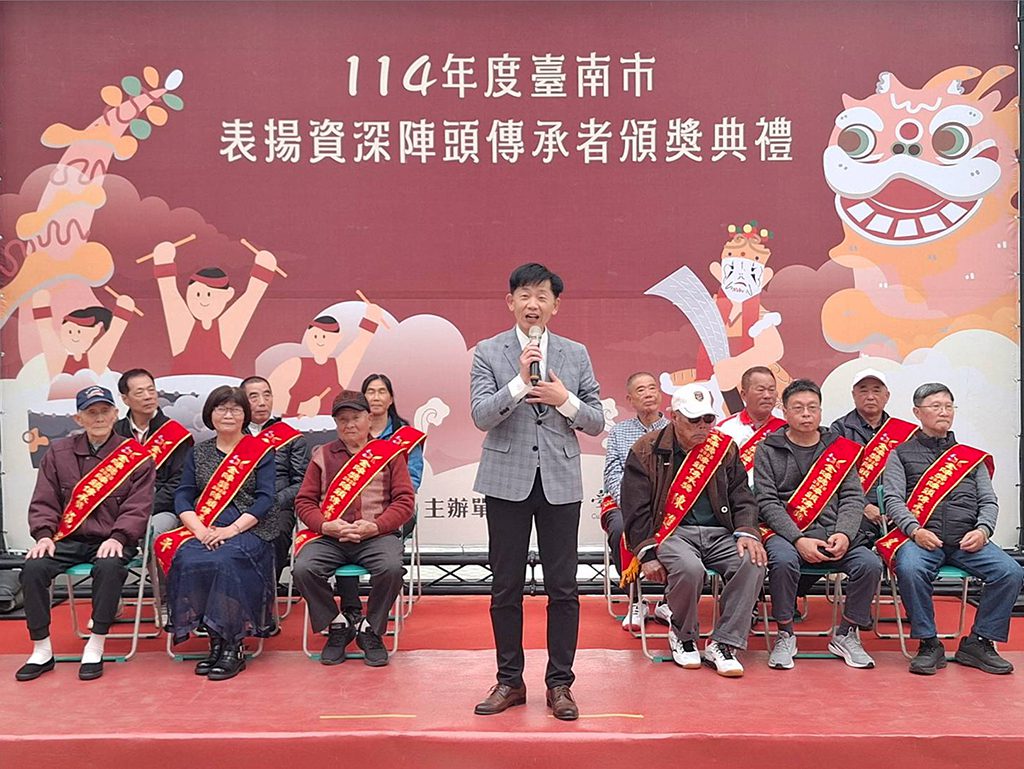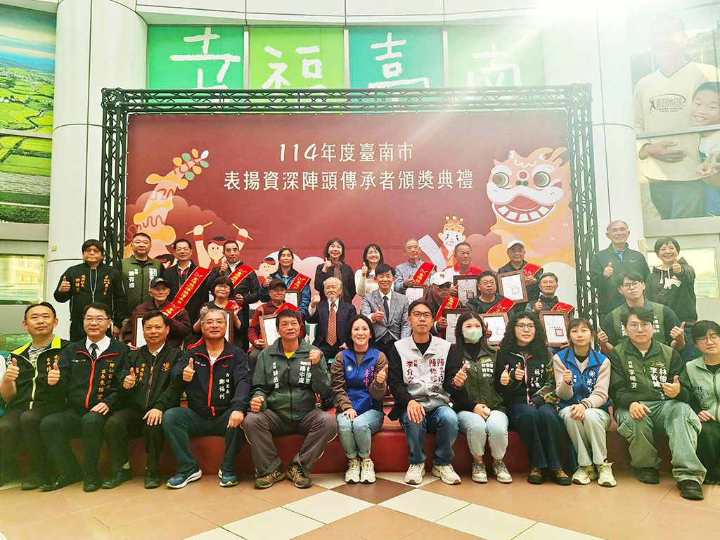 【記者吳玉惠/臺南報導】 臺南市政府為深化陣頭文化保存與傳承,延續113年訂定之臺南市政府文化局表揚資深陣頭傳承者作業要點,持續受理民眾提報長期投入陣頭文化之教練。經推薦與審查程序,於114年度遴選出十二位長年耕耘藝陣、深具代表性的資深教練,今年於頒獎典禮中公開表揚,由副市長葉澤山出席頒獎,肯定教練們多年來默默付出、薪火相傳的文化貢獻。
