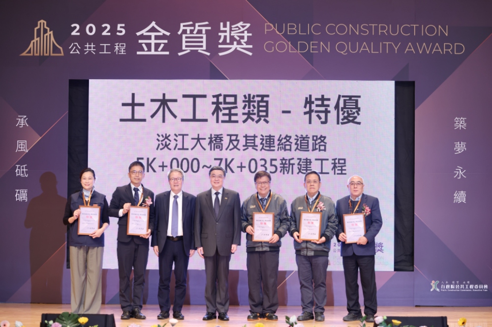 行政院公共工程委員會於1/21日舉行「第25屆公共工程金質獎」頒獎典禮,行政院院長卓榮泰親臨典禮,並頒發「公共工程品質優良獎」、「公共設施維護管理獎」及「個人貢獻獎」特優獎,向得獎團隊與觀禮人員表達感謝。