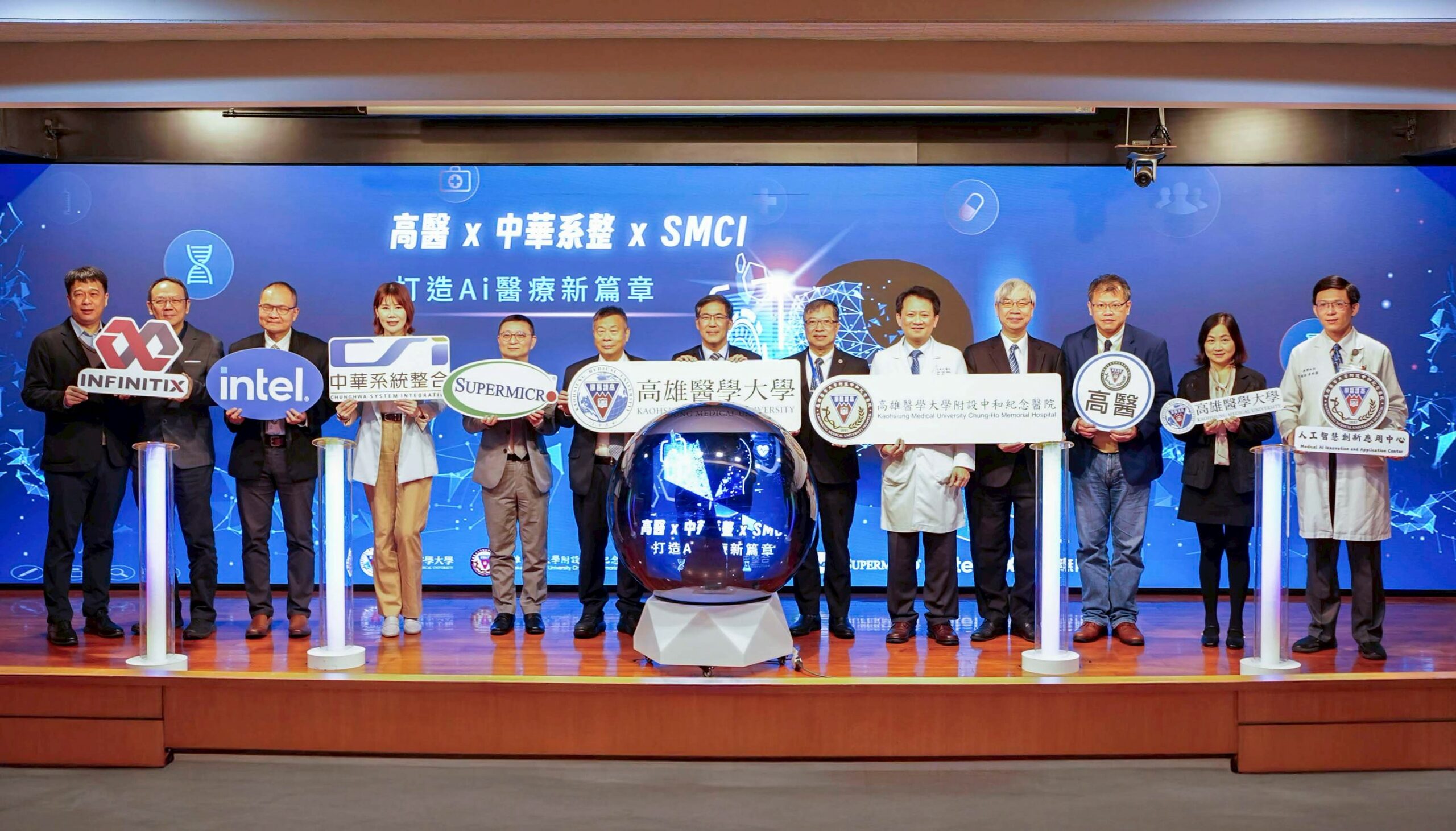 高雄醫學大學附設中和紀念醫院(高醫)於(2026)年1月23日盛大舉行 「NVIDIA B300 GPU 高效能運算平台啟用儀式」,正式宣告成為全台首家導入新一代 NVIDIA B300 GPU 高效能運算平台的醫療機構。此一里程碑式的建置不僅強化了院內 AI 運算能力,因應全球醫療 AI 應用需求的快速成長,更為台灣智慧醫療實踐描繪出新的願景,象徵醫療產學研醫跨域合作邁向更高層次。活動邀集高醫董事會陳建志董事長、校長余明隆、院長王照元、中華系統整合公司吳明德、美超微電腦公司(Supermicro)林振瑋總經理等重要夥伴,共同點亮象徵智慧醫療起航的啟動球,呈現高醫深耕智慧醫療的堅定決心與全球視野。