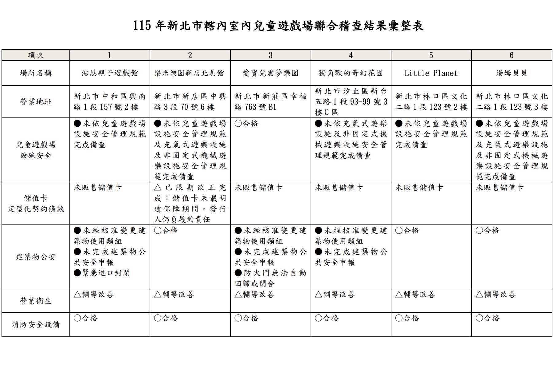 寒假與春節假期將至,許多家長會帶著孩子前往室內兒童遊戲場遊玩。為保障兒童遊戲安全並維護家長消費權益,新北市政府消保官會同經濟發展局、工務局、衛生局及消防局聯合執行室內兒童遊戲場稽查專案,抽查6家兒童遊戲場的設施安全、建築物公共安全、消防安全設備、營業衛生及儲值卡定型化契約條款是否符合法規要求。結果發現6家業者均有不同程度缺失(如附表),各主管機關已當場輔導業者並責令限期改善。