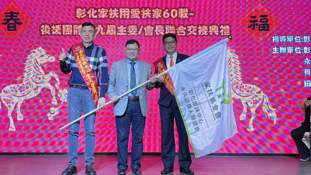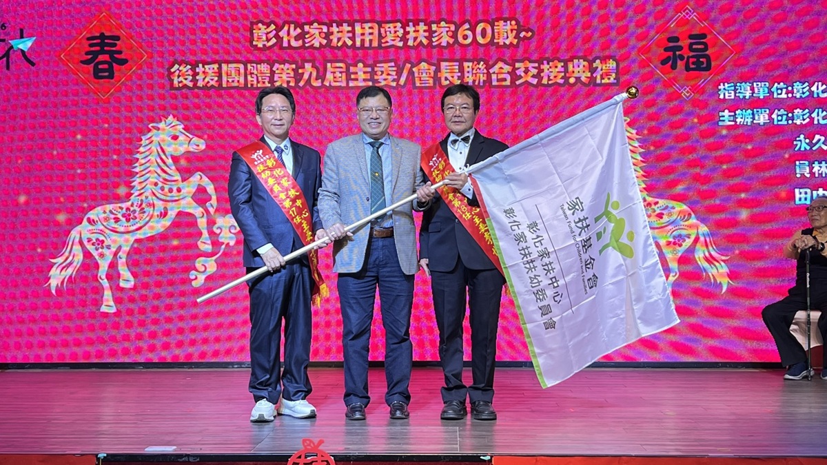彰化家扶成立至今年屆滿 60 周年,在這充滿榮耀與感恩的時刻,24日於花壇全國麗園辦理「2026無窮世代~彰化家扶後援團體第九屆主委/會長聯合交接授證典禮」。現場匯集了來自各界的愛心能量,彰化家扶扶幼委會現任主委辜福榮正式將服務接力棒移交給新任主委李世湧,永久認養人聯誼會現任會長葉茂芳交棒給新任會長蔡樹火,員林區扶幼委員會現任主委黃秀美交棒給新任主委鐘欽照,田中區扶幼委員會現任主委邱淑慧交棒給新任主委宋功超,在各界長官的見證下,象徵這份守護弱勢兒少的「甲子深情」將持續傳承,邁向新的一個里程碑。
