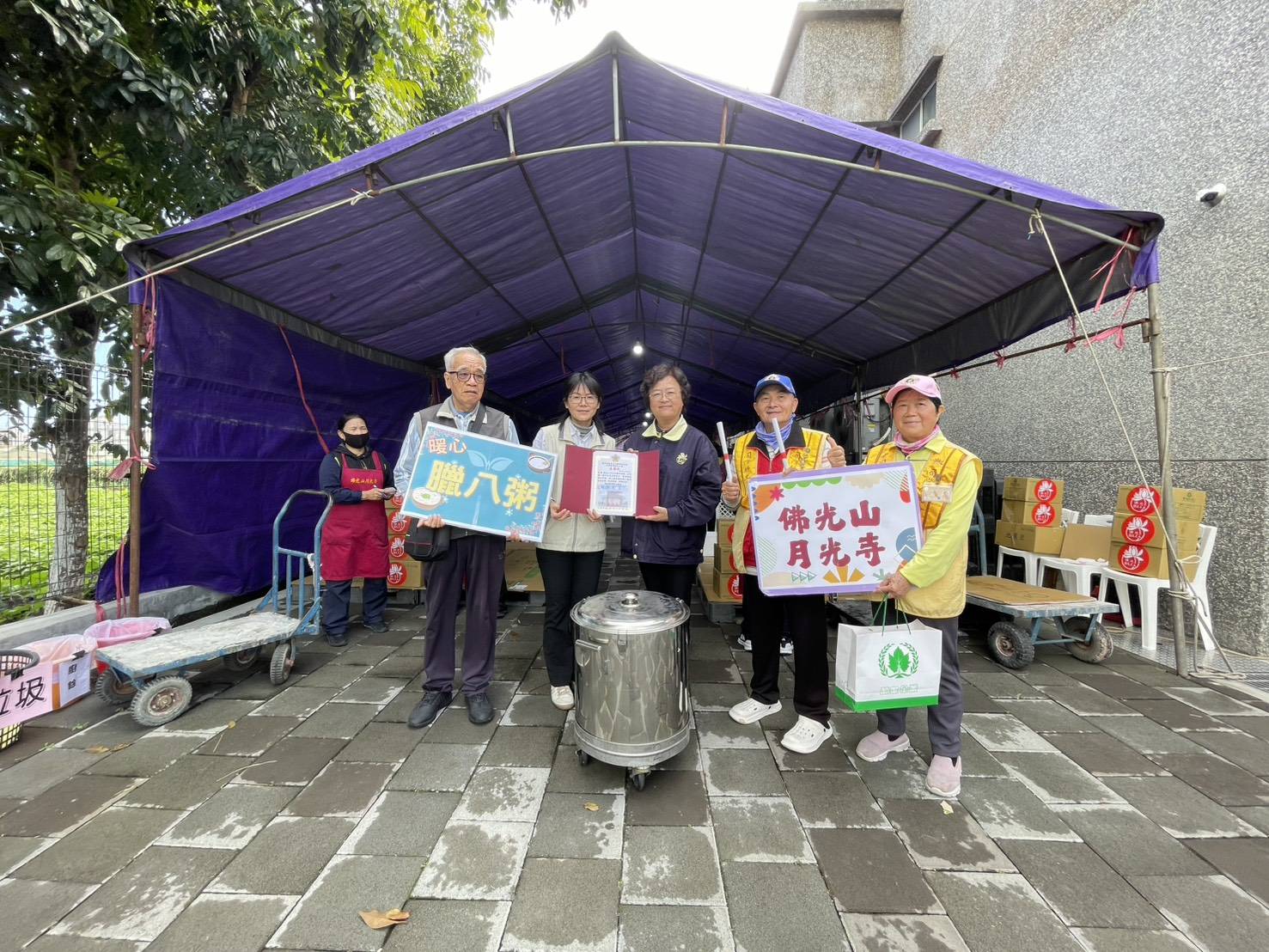 ▲花蓮榮家由長期擔任佛光寺志工的住民長輩代表領取祝福的臘八粥。
