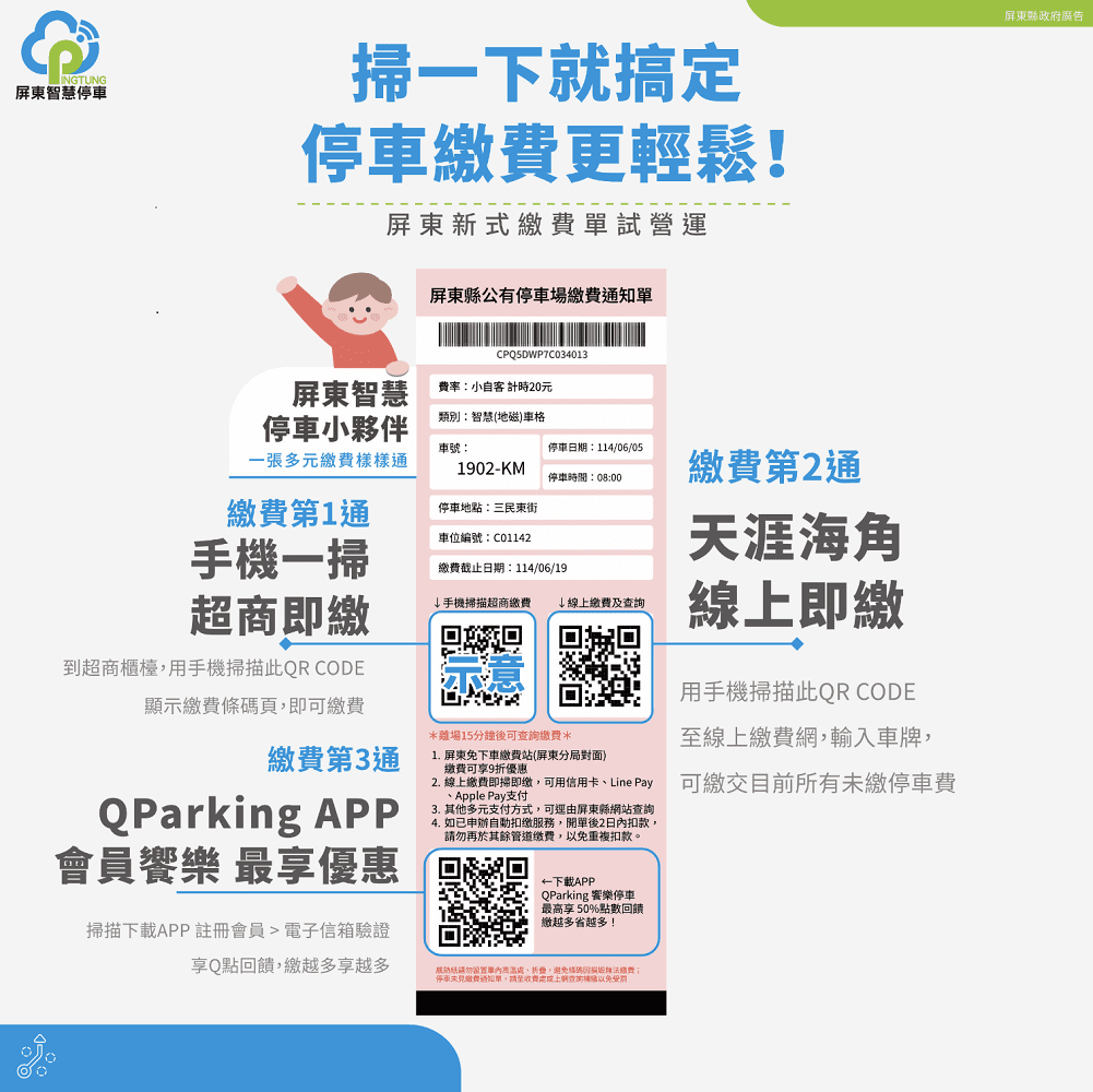 縣府交通旅遊處表示,屏東縣路邊停車管理已深耕多年,近年委託辦理智慧化管理技術,透過地磁感測設備精準偵測車輛停放狀態,減少人力繞行、提高停車數據掌握效率,邁向綠能減碳的智慧城市。本次試營運路段導入的新式地磁系統,可即時掌握車輛停放資訊,並同步產製全新格式的停車繳費通知單,讓收費資訊更清楚、操作流程更直覺。