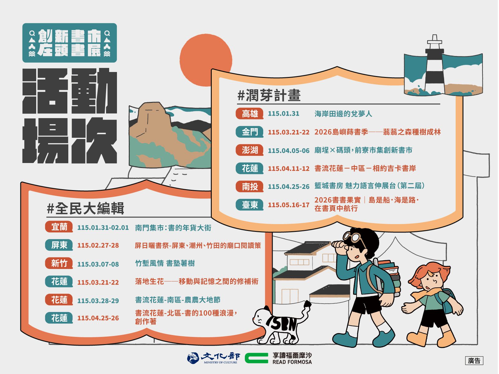 文化部表示,「創新書市 庄頭書展」持續走進各地生活現場,希望讓閱讀不分年齡與背景,都能自在發生在日常之中。書市活動將持續進行至五月,歡迎民眾走進各地創新書市,感受閱讀帶來的樂趣,更多「創新書市 庄頭書展」相關資訊,請至「享讀福爾摩沙」官網(https://readtaiwan.moc.gov.tw/)或官方粉絲專頁(https://www.facebook.com/readformosa/)查詢。