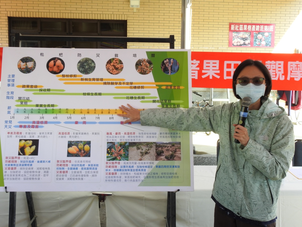因112、113年高溫乾燥,造成枇杷花蕾乾枯酥化(俗稱酥花) 造成枇杷減產,近期洽逢開花期,為穩定生產,農業部臺中區農業改良場於臺中市新社區吳慶源班長果園,辦理「微噴霧設備提高枇杷著果田間觀摩會」,由該場楊宏瑛場長與新社區農會羅文正總幹事共同主持,現場分享田間管理調整作為及防災設(施)備應用、枇杷田間病蟲害及疣胸琉璃蟻防治技術,並宣導農業政策,與會貴賓包括農糧署中區分署、臺中市政府及在地枇杷農友共71人熱情參與。