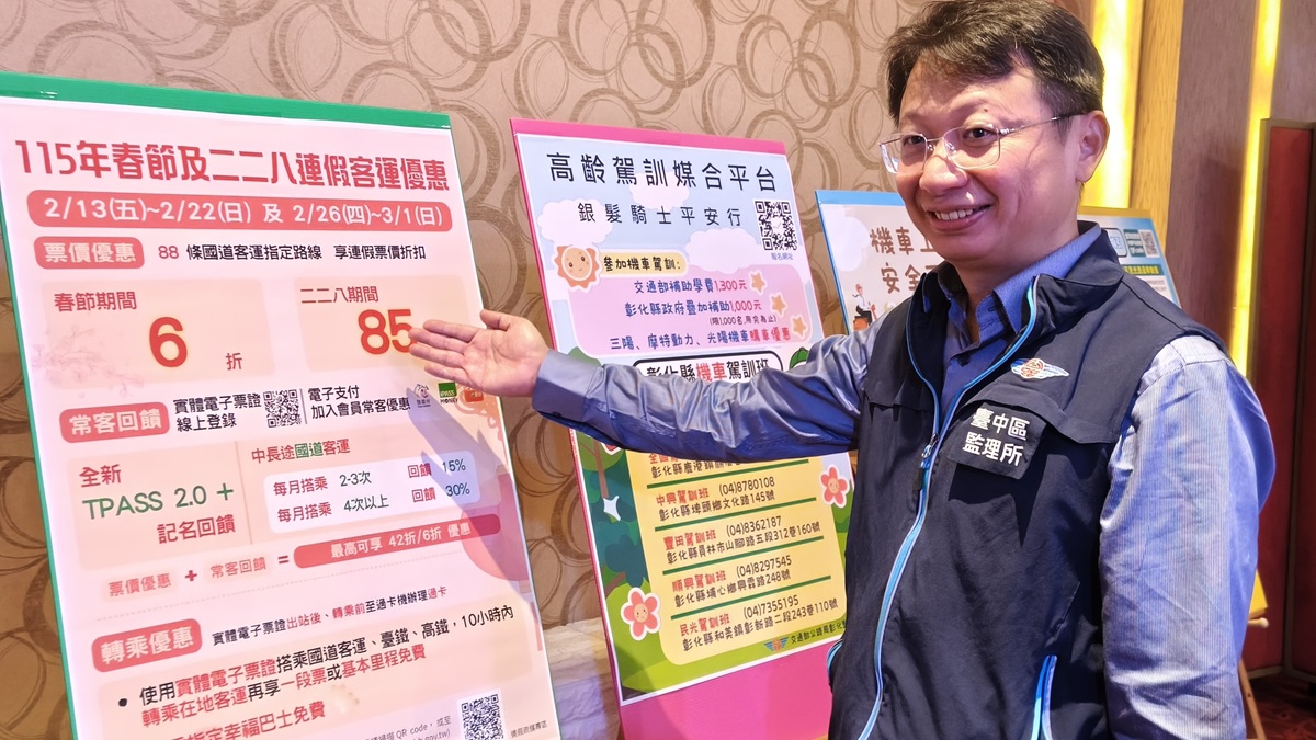 交通部公路局為紓解春節連假返鄉及出遊的人潮,於115年2月13日至2月22日推出多項客運優惠措施,包含88條國道客運路線享票價6折優惠,持TPASS2.0+票卡搭乘者最高可享42折優惠,另搭乘國道客運、臺鐵及高鐵轉乘在地客運,可享基本里程或1段票免費優惠,轉乘指定幸福巴士全程免費,歡迎民眾多加利用。