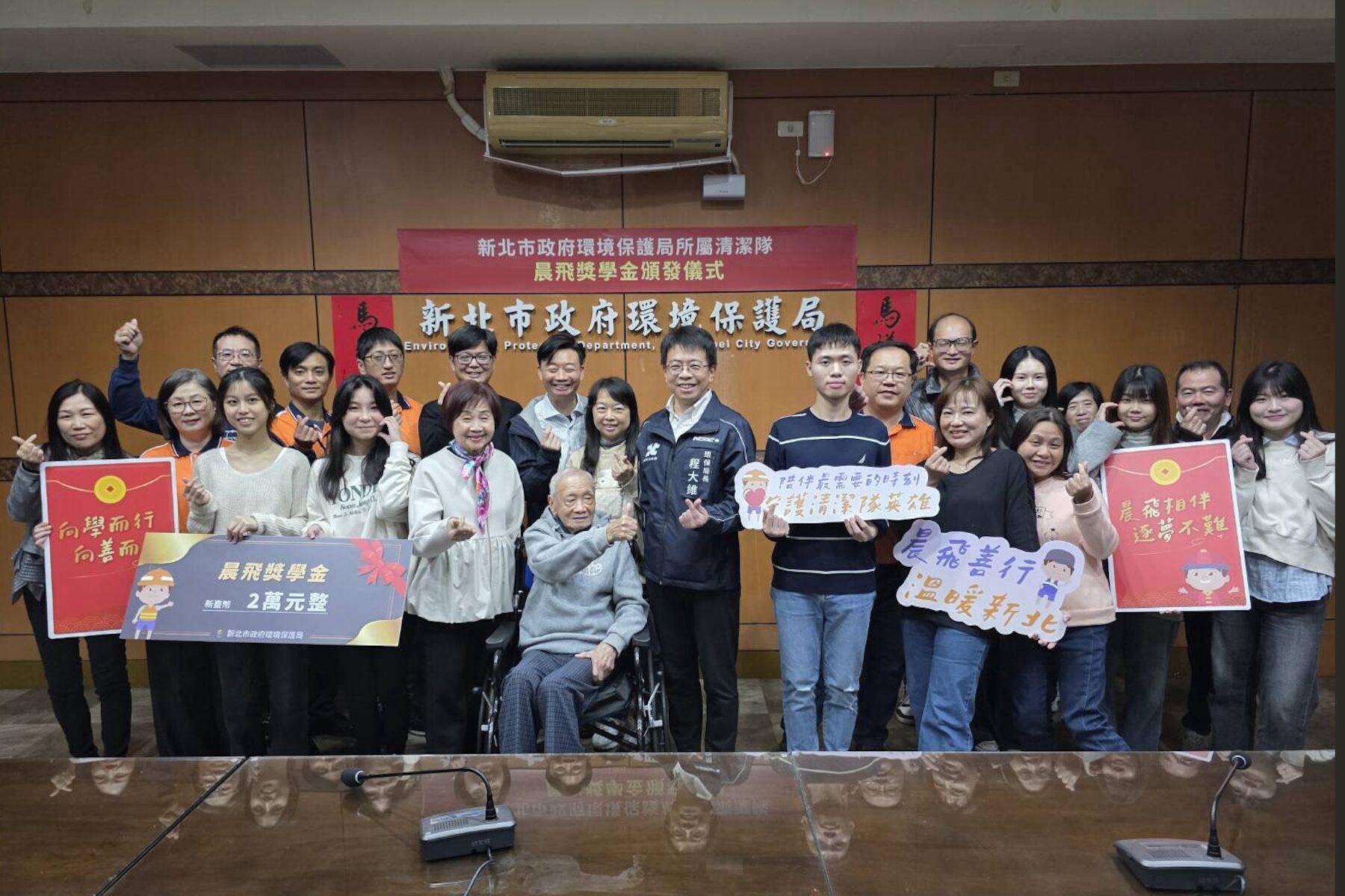 新北市環保局於(28)日舉辦「新北市政府環境保護局所屬清潔隊晨飛獎學金及急難救助金」捐款暨頒獎儀式,感謝善心人士陳輝先生及陳念平先生慷慨捐助,以實際行動長期關懷基層清潔隊員及其家庭,展現社會溫暖與善的循環。