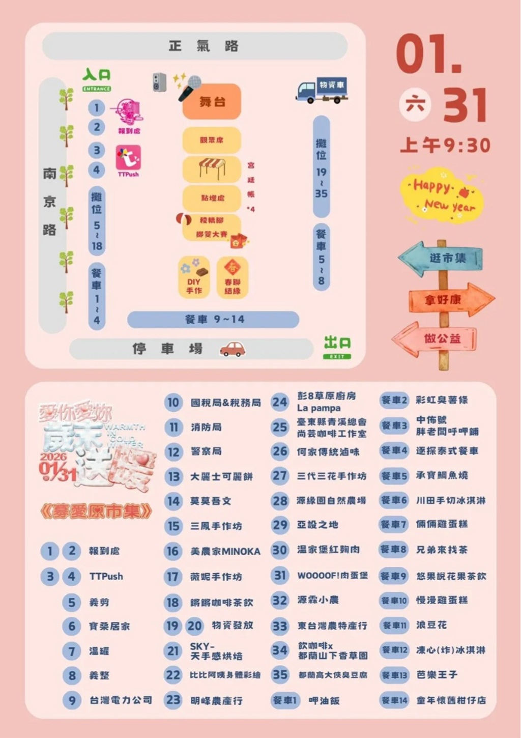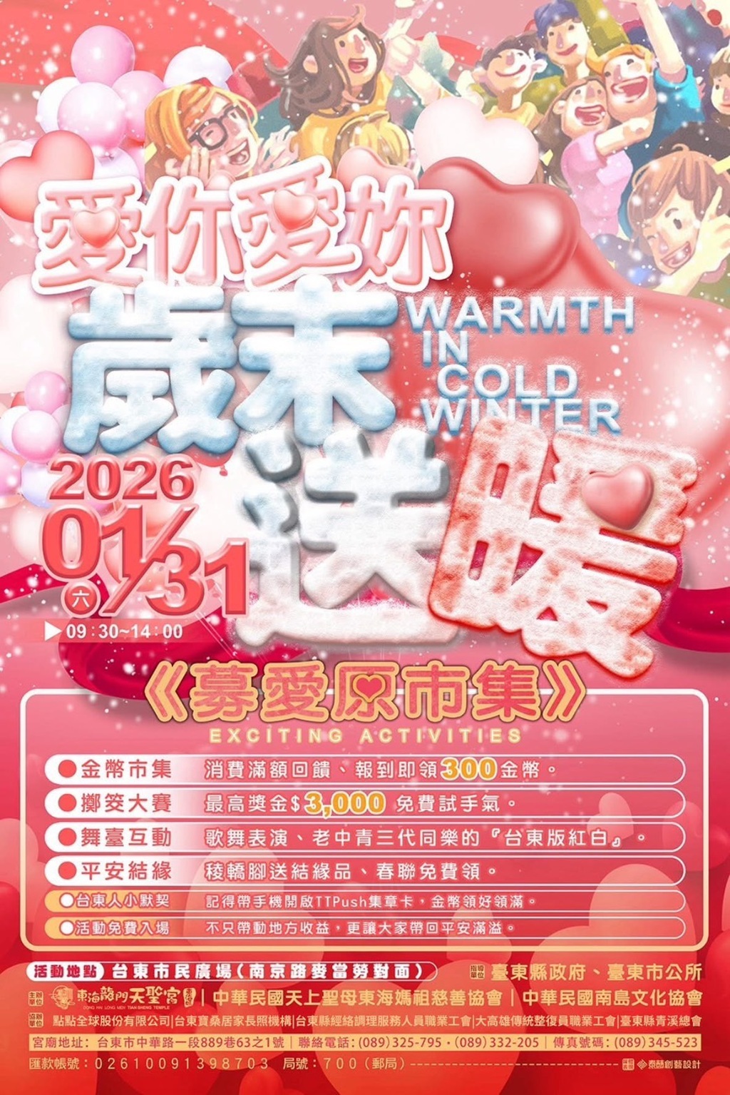 【記者 陳法水/台東 報導】明日(31日),台東市民廣場將迎來一場充滿愛心與溫暖的盛會—『愛你愛妳歲末送暖』市集。這項活動自16年前開始,東海龍門天聖宮每年如期舉辦,透過真誠的公益行動,將愛心傳遞給每一位需要的人。它是台東人共同的年度盛事,更是凝聚社區力量的最佳體現。