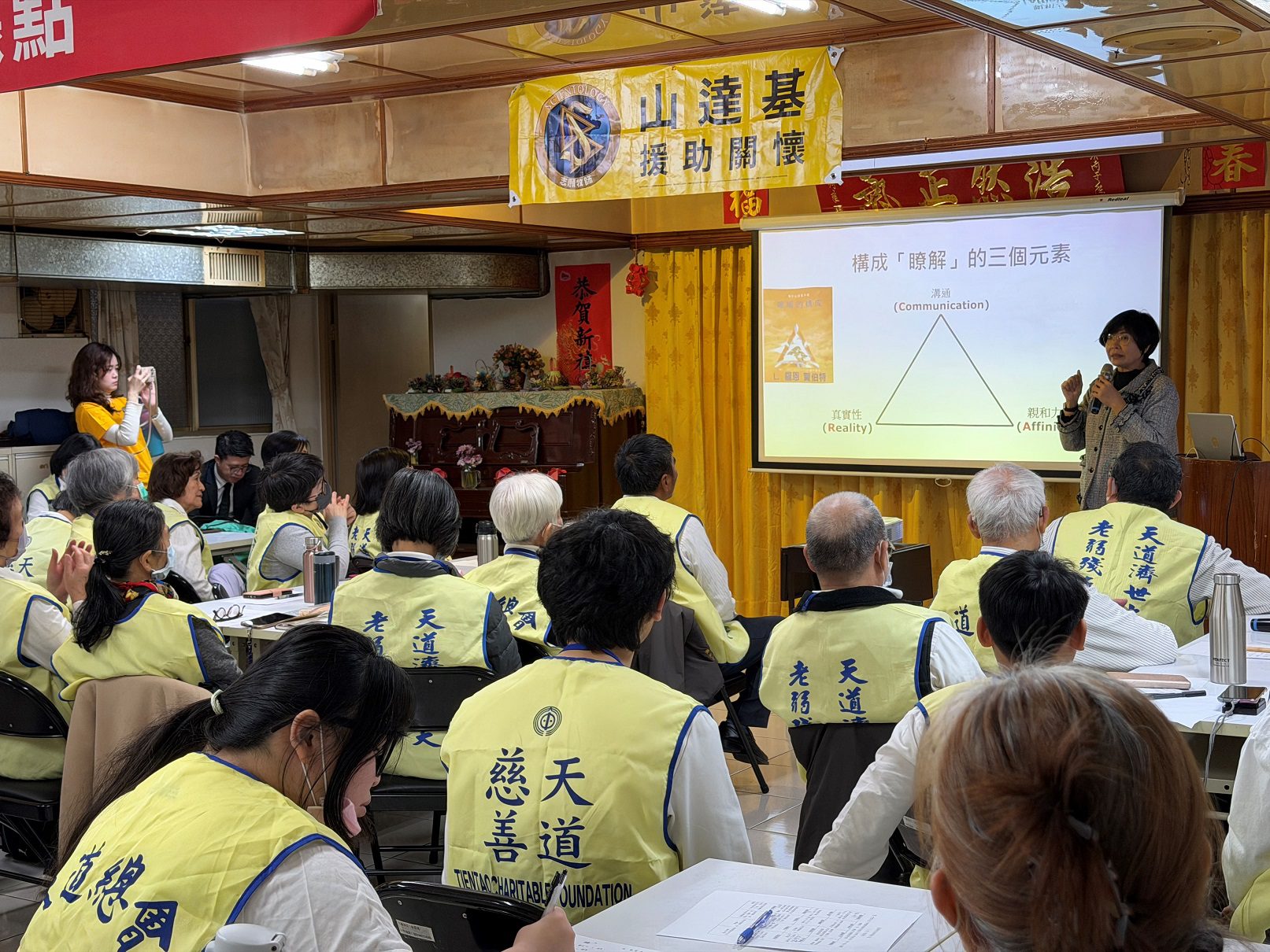 ▲中正大學兼任講師林妙香(圖中)講授「服務中的溝通智慧」,引導志工運用系統化的溝通技術,解決服務過程中常見的人際難題。(圖/山達基教會高雄機構)
