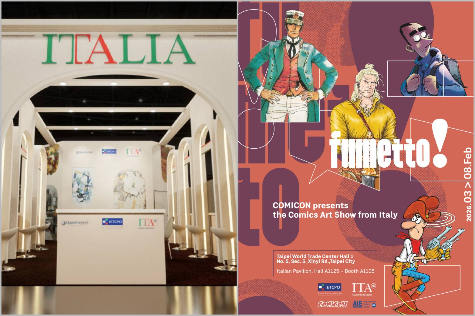 同步登場的「Fumetto! 12」漫畫特展,與南義最具指標性的拿波里COMICON合作,精選12個義大利漫畫史上的經典角色,從1938年誕生的《Dick Fulmine》,到《Tex Willer》、《Pepito》等代表作,回顧義大利漫畫橫跨百年的藝術演進與文化影響,展現圖像敘事在文學與視覺藝術之間的創新能量。
