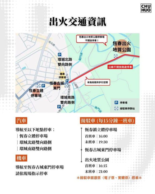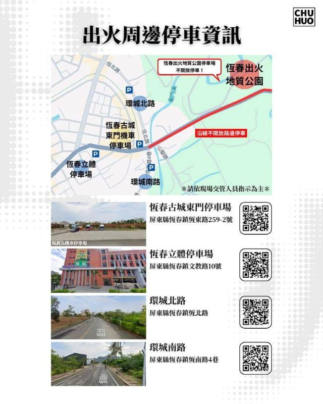 三、嚴禁違規:出火地質公園周邊道路嚴禁違規停車,屆時屏東縣政府警察局恆春分局將加強巡邏與取締,以確保屏200縣道車輛動線流暢。