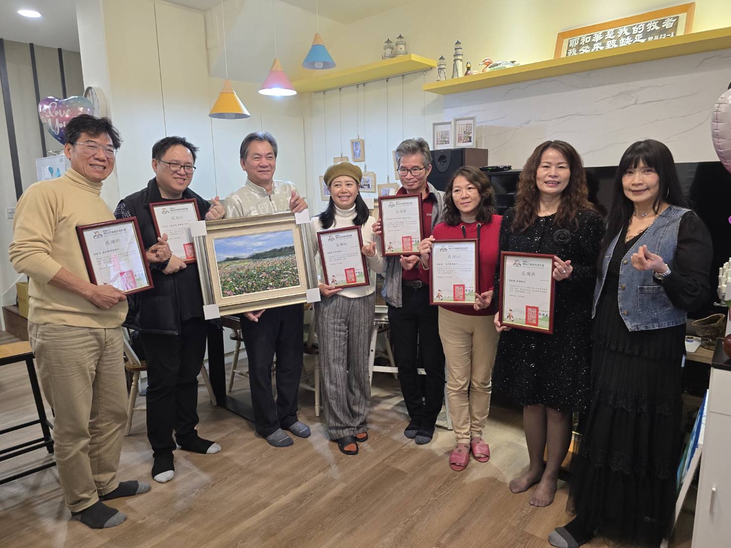 ▲眾人見證下,素人畫家楊心彤(右六)將義賣畫作所得捐助博幼基金會,由花蓮中心主任葉凌雲(右五)代表接受 。(圖/范振和攝,下同)