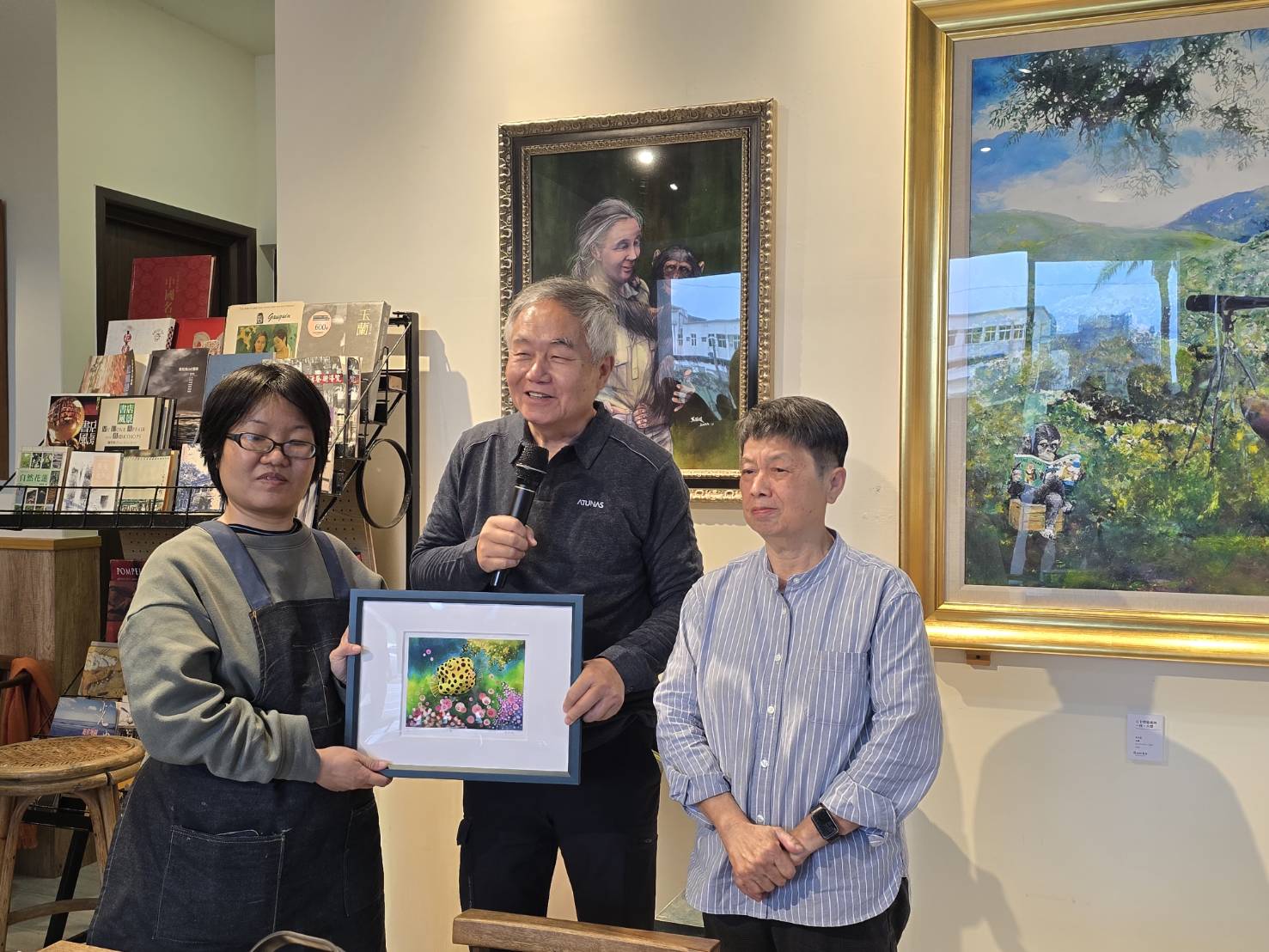 ▲知名的山月村村長鄭明岡(中)認購藝術家馬筱媛(左)的作品。