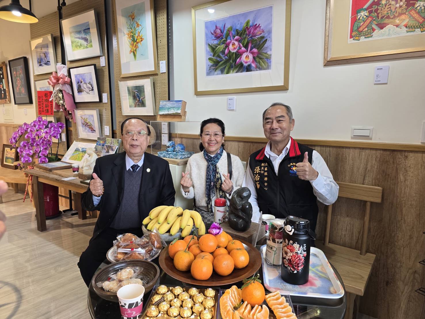 ▲花蓮縣台北科技大學校友會榮譽會長張銘峰(中)選購畫作收藏,更生日報社長謝立德(左)、藝廊主人林滿津(右)鼓掌叫好。