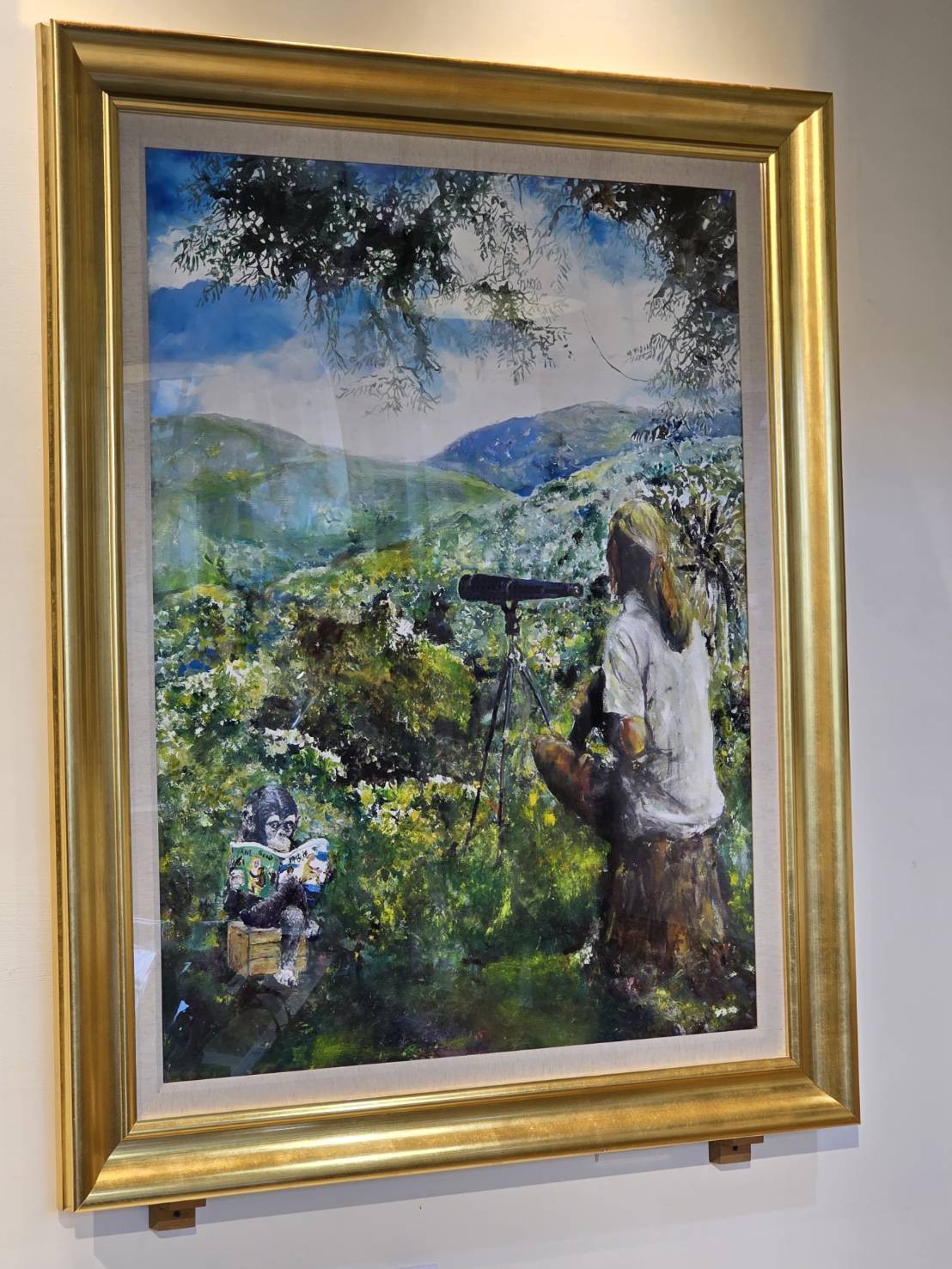 ▲這幅珍古德關愛野生黑猩猩的畫作,出自畫家侯文欽之手,是林滿津相當喜愛的傑作。