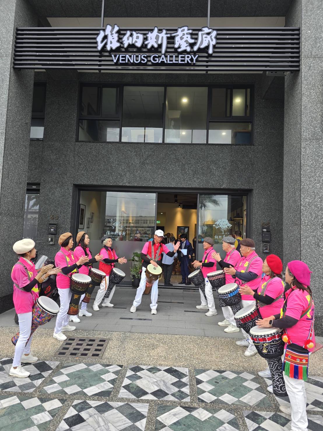 ▲花蓮維納斯藝廊喬遷開幕,藝術總監陳政宏(中)引領非洲鼓表演,友情助陣。(圖/范振和攝,下同)