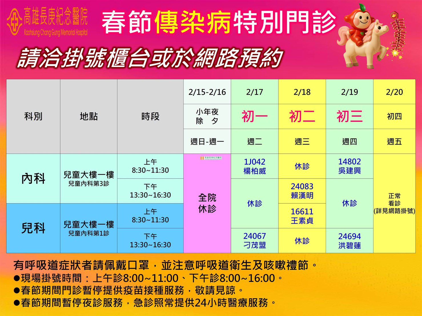 因應春節期間常見的流感及呼吸道傳染病需求,自2月17日(週二)至2月19日(週四)特別加開「春節傳染病特別門診」。凡有發燒、咳嗽、喉嚨痛等呼吸道症狀之民眾,可透過網路預約掛號,至特別門診就醫;2月20日(週五)起,全院門診將恢復正常服務。另考量慢性病病人回診需求及避免慢性病用藥中斷,預定春節期間回診之慢性病病人或慢性病連續處方箋給藥屆滿(用罄),可提前自1月31日起領藥回診處方給藥或預領下個月(次)用藥。