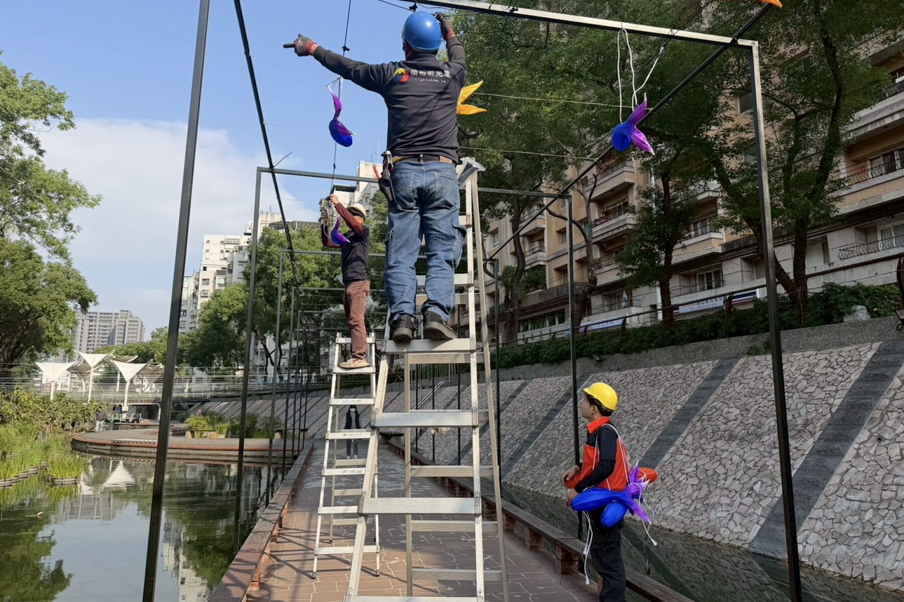 眾所期待的2026年新莊中港大排光雕展正如火如荼進行布展。為帶給市民最震撼的視覺饗宴,工程人員也加緊腳步安裝燈飾與測試。新北市政府水利局提醒,河廊布展期間,請遊客休憩散步時務必注意自身安全,並配合現場導引。