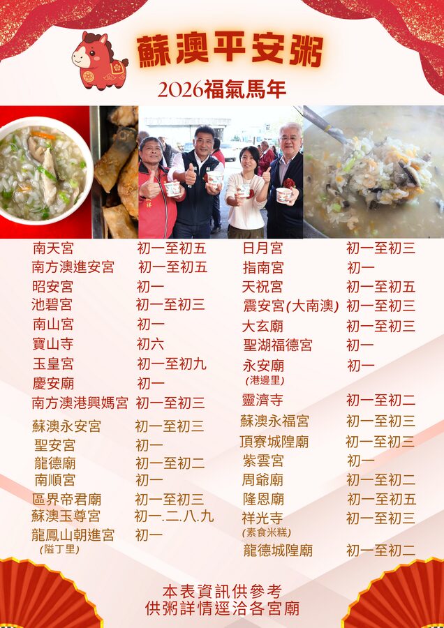 李明哲表示,蘇澳的平安粥不僅是美食,更是地方鄰里凝聚力與宗教溫情的象徵,歡迎大家到蘇澳旅遊、走春、拜廟、吃平安,留下馬年最美好的回憶。供粥詳情請逕洽各宮廟;另為響應環保,請大家自備餐具。