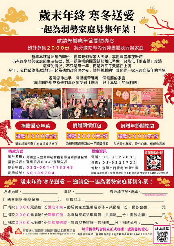 目前宜蘭聯勸年菜募集行動仍在進行中,呼籲社會各界發揮愛心,踴躍響應共襄善舉。
