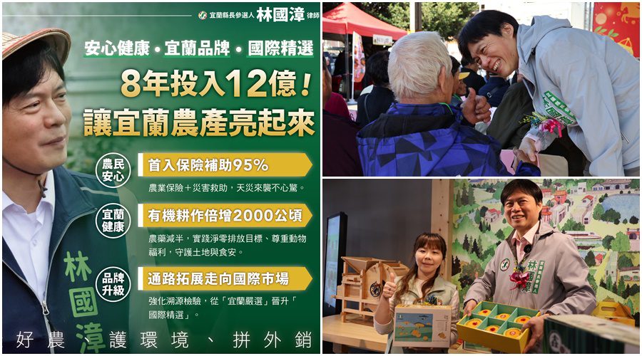 宜蘭縣長參選人林國漳1月4日由縣議員林詩穎等人陪同,出席頭城鎮農會農民節活動時向農友提出農業政見,說明安心健康—「宜蘭品牌」好農計畫,承諾將投入12億元經費,透過「農業保險雙軌保障」、「有機面積倍增」以及「建立動物福利基準」三大支柱,將宜蘭農產從「在地嚴選」提升為「國際精選」。