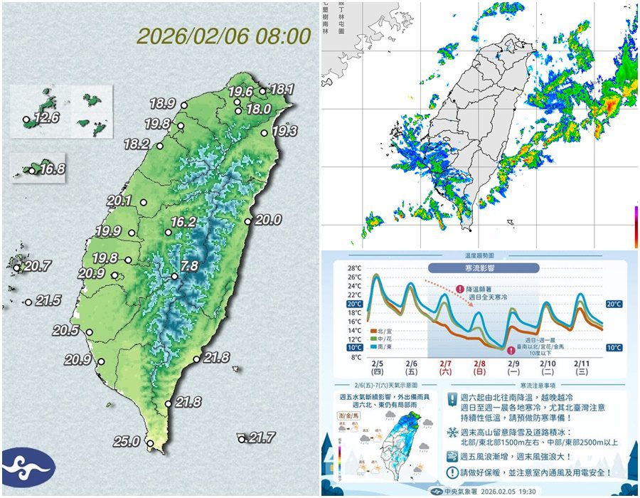 今天2月6日鋒面通過,北部、東北部及東部有短暫雨,南部、東南部、恆春半島及中部山區有局部短暫雨,其他地區及澎湖、金門、馬祖有零星短暫雨,外出請備雨具。