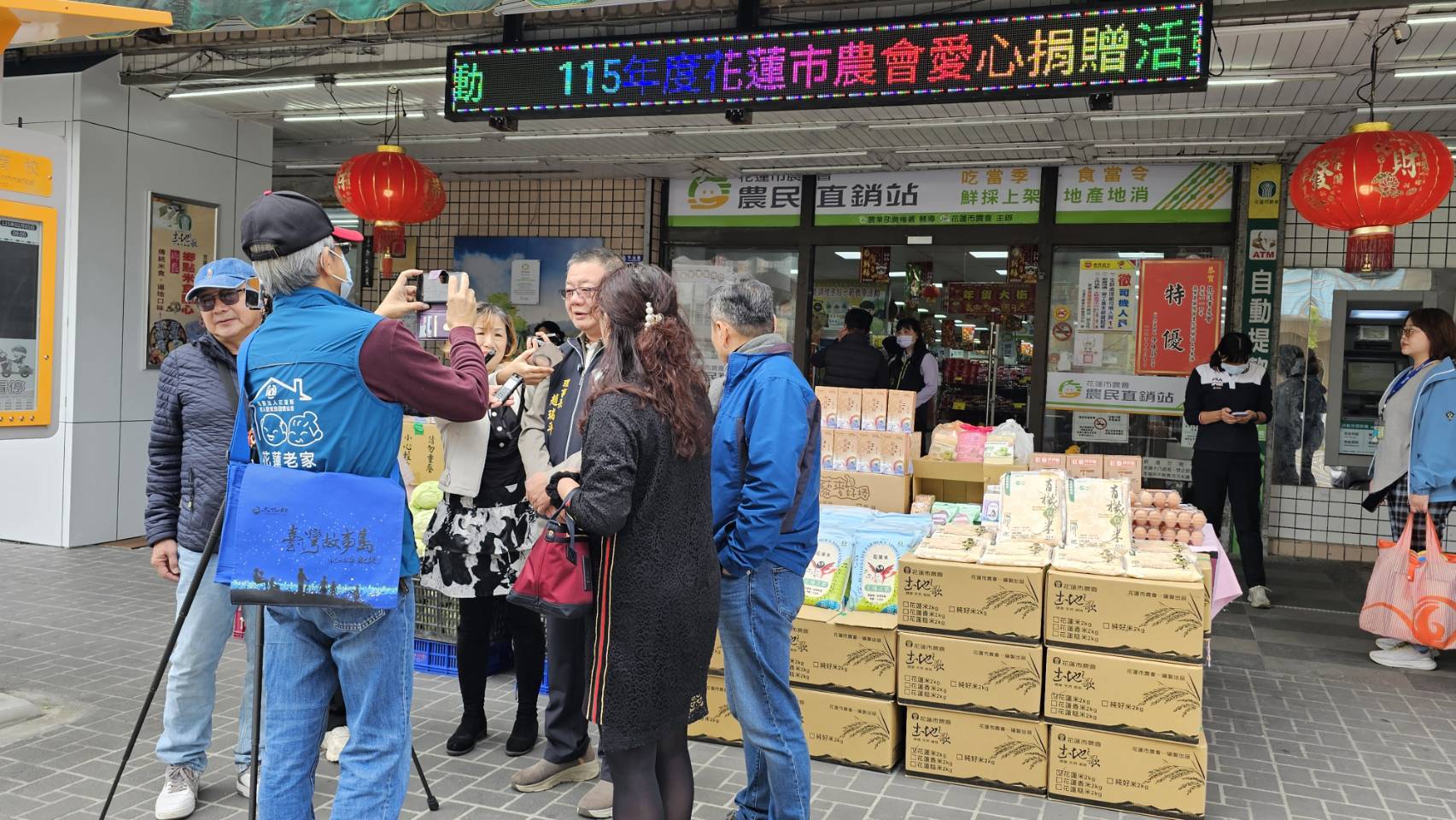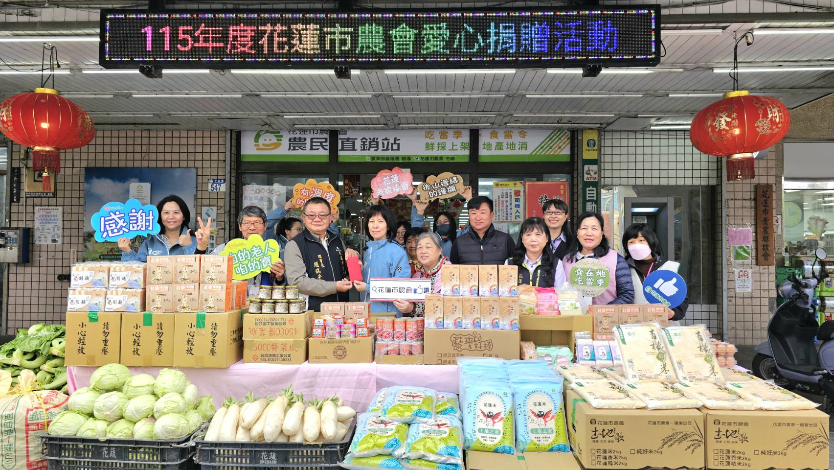 花蓮市農會捐贈新臺幣6萬3000元,並提供1,000餘公斤白米、雞蛋、麵條、蔬菜,以及蜂蜜、酥條等農產加工品,希望老人暨家庭關懷協會弱勢家庭與獨居長者平安過好年。
