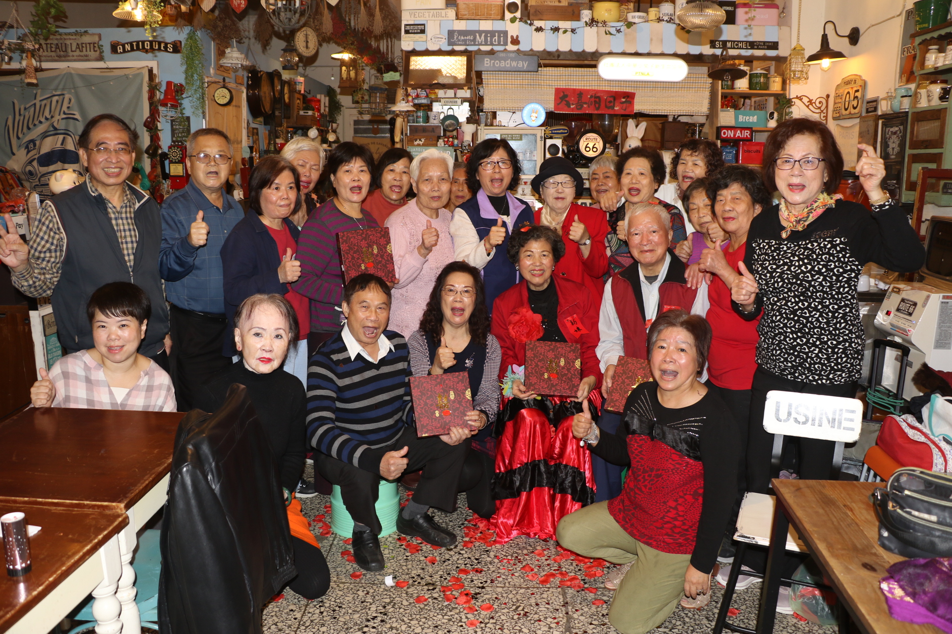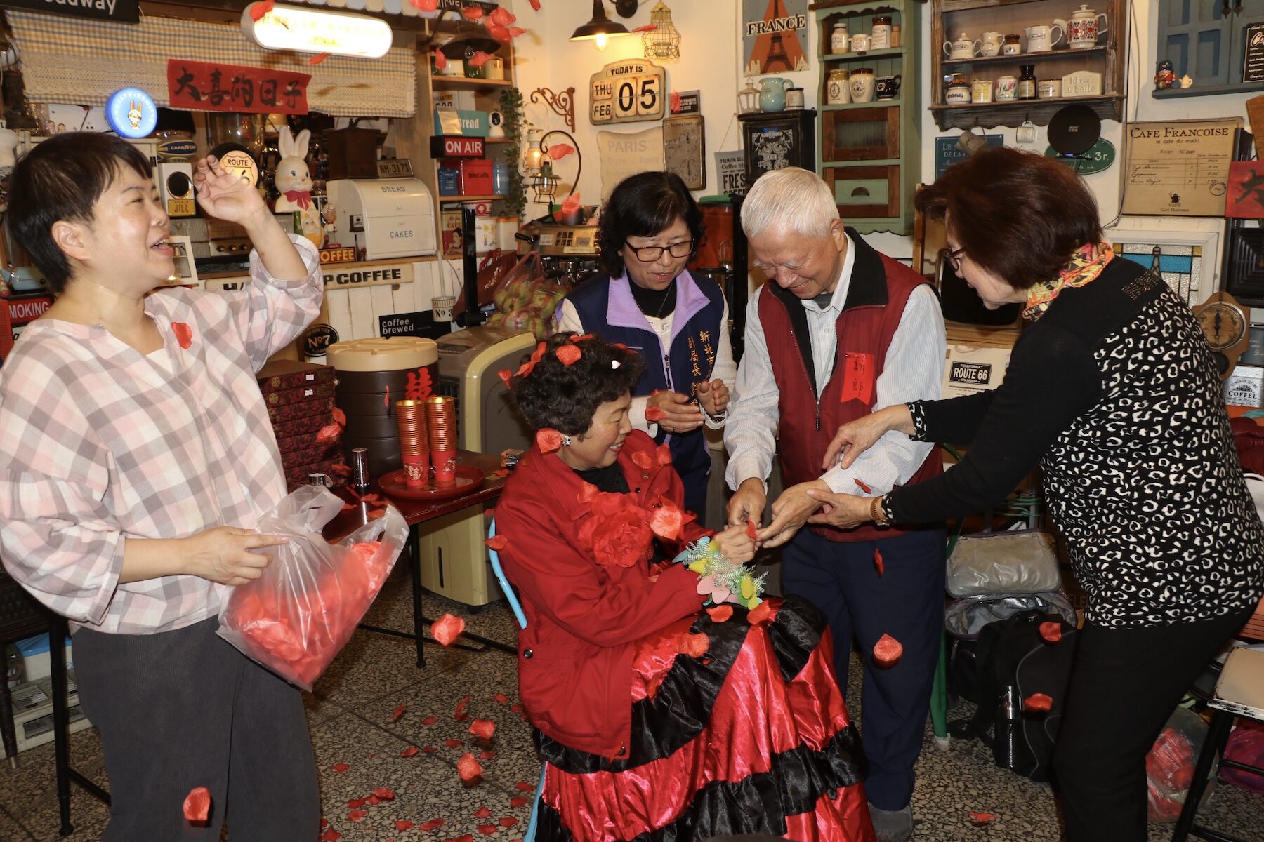 「深山內迎花轎/鼓吹八音玲瓏叫/內山的姑娘呀/坐轎要出嫁喲…」位於板橋中山路二段光仁中學校門巷內小兔子照顧關懷據點,5日中午傳來鞭炮聲,原來據點內一對高齡長輩,在歷經2年多同窗情誼,及一場突來襲來的生死考驗,兩人決定廝守終身。社會局副局長許秀能受邀為這對老新人見證,並祝福他們彼此相互照顧扶持,繼續在據點上課。所有在據點的長輩也一起分享幸福,品嘗據點準備的甜茶和喜餅。