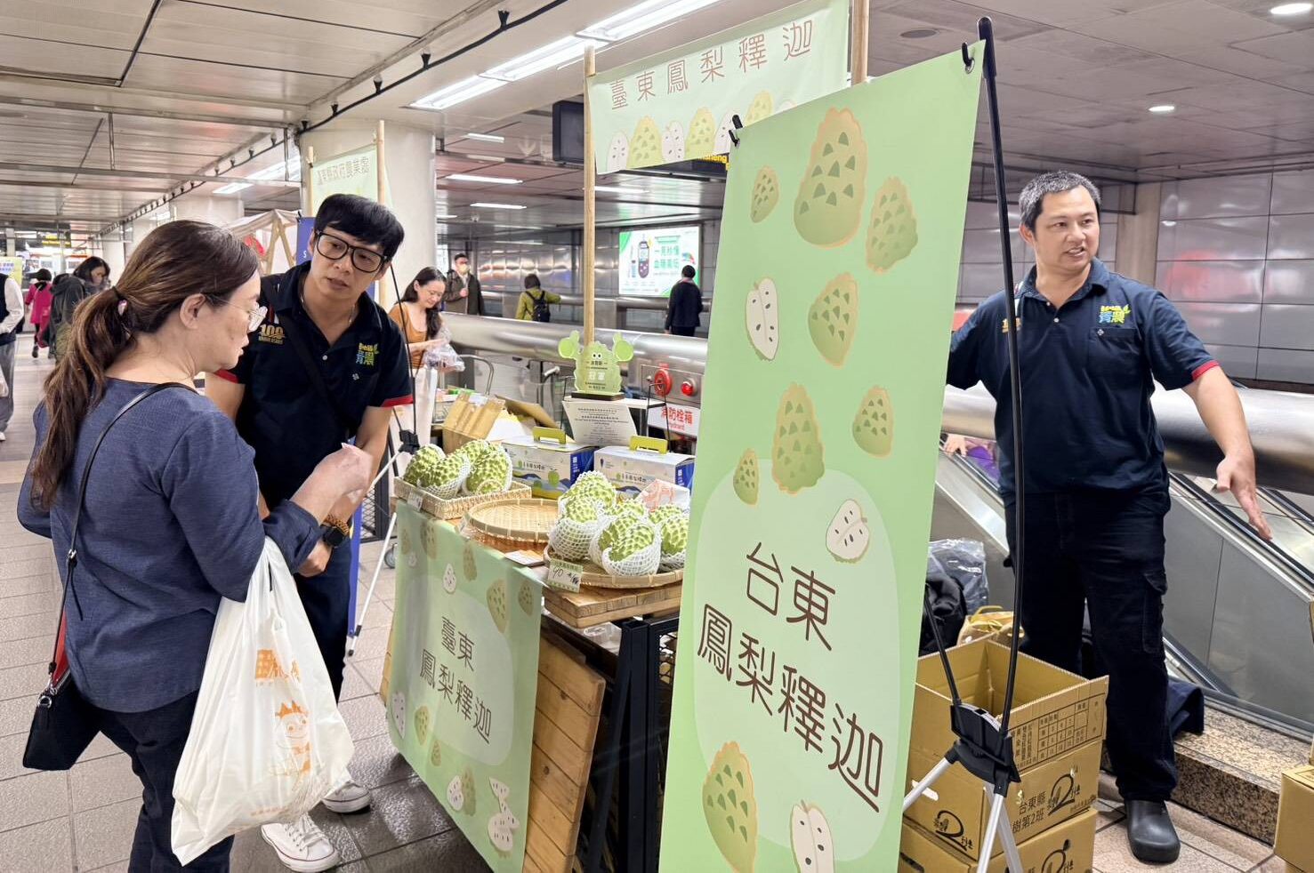目前臺東鳳梨釋迦正值產季,今年縣府持續深化與北捷合作模式,啟動「展售+企業採購」推廣策略,運用捷運站高流量與強大曝光效益,於捷運站內與戶外場域設置展售攤位,媒合北捷推動企業團購,讓推廣效益由民眾試吃選購延伸至企業端訂單,更具規模性訂單支持在地農民。
