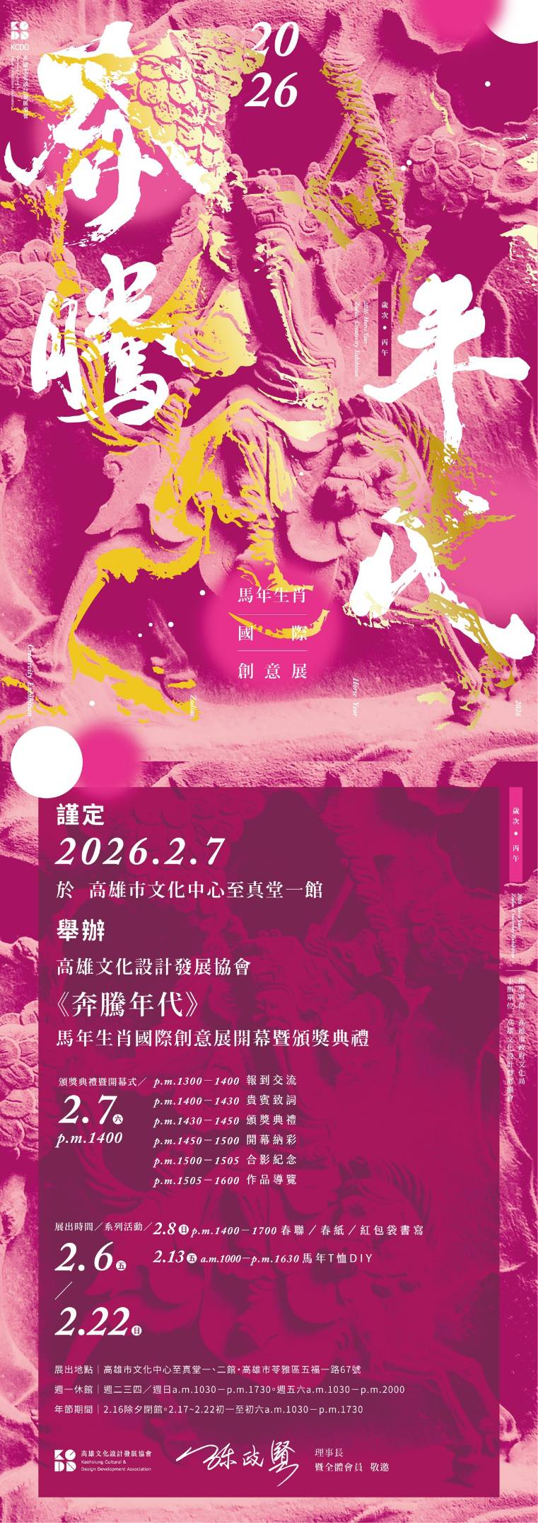 2026丙午馬年正逢春節期間,高雄文化設計發展協會(KCDD)於高雄市文化中心至真堂一、二館推出「2026『奔騰年代』生肖國際創意展」,以「馬」為主題貫穿展覽、活動與教學三大軸線,整合設計、藝術、工藝與生活美學,讓傳統生肖文化注入當代創意新意。展覽自2月6日至22日展出,透過圖像設計競賽與創作展出、DIY課程、春聯與紅包袋書寫等活動,鼓勵觀眾從多面向感受馬年文化意義,體現馬的純陽象徵、躍動精神與自強不息的生命力。本展同時由高雄市政府文化局與青年局支持,旨在以設計表現傳統生肖文化的新生命。