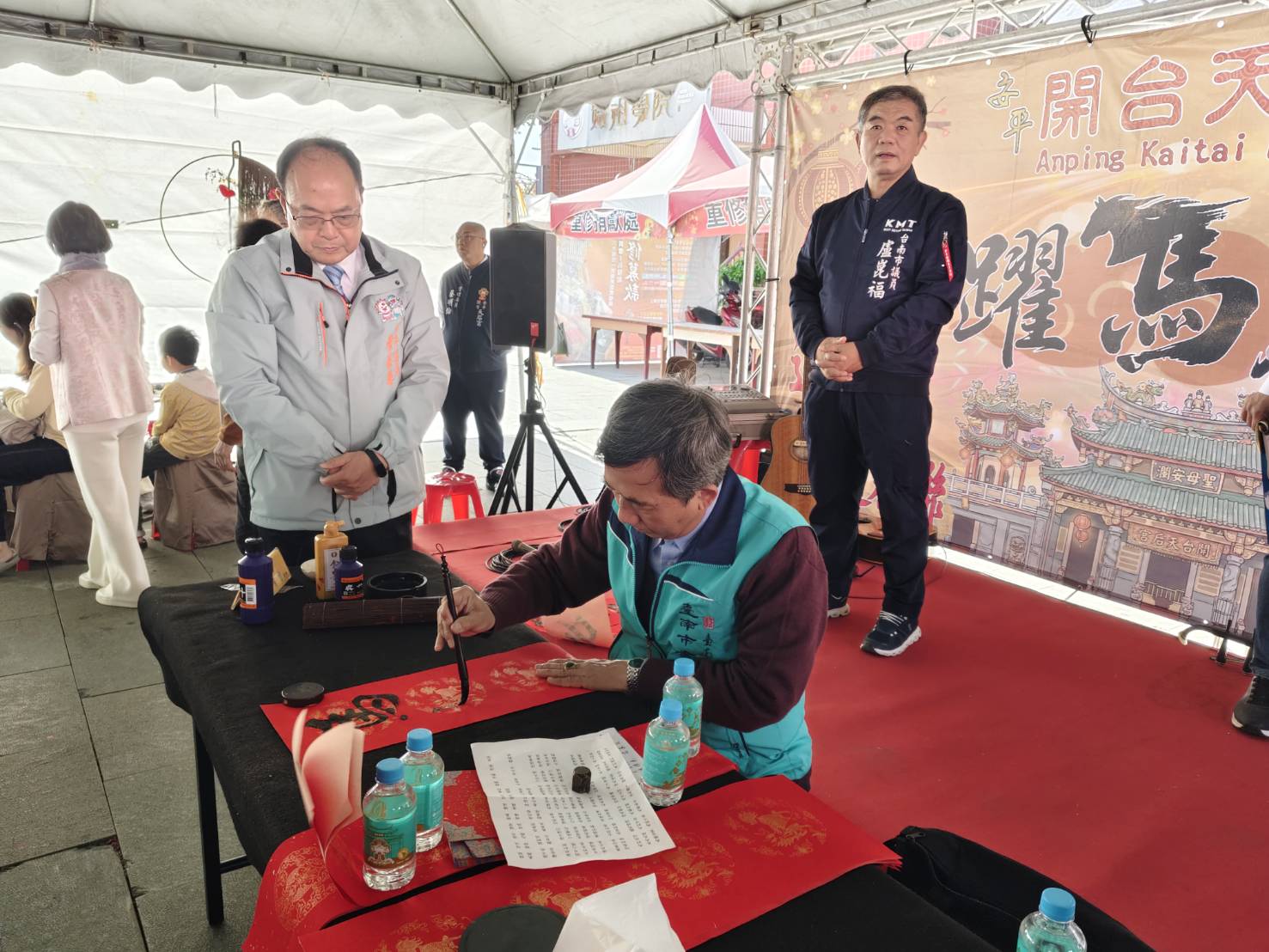 台南安平開台天后宮於春節前夕,7日邀請7位書法家、6位茶藝老師於廟埕辦理寫書法送春聯、賞茶,廟方主委盧友禮表示,他擔任主委以來每年均辦理此活動,今年邁入第6年,今年廟方準備200個媽祖茶杯送給品茶民眾,吸引上千位民眾前往同樂。