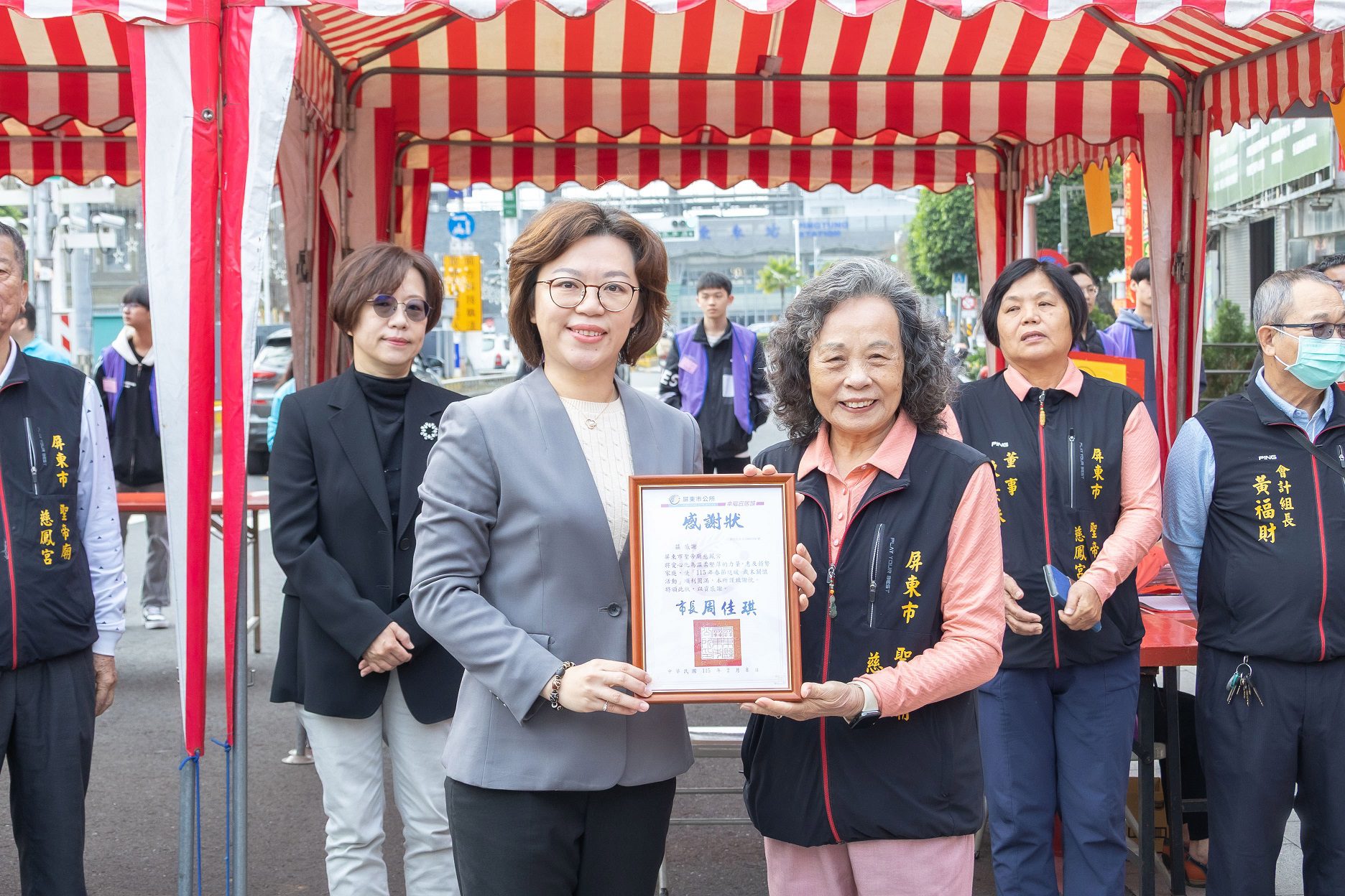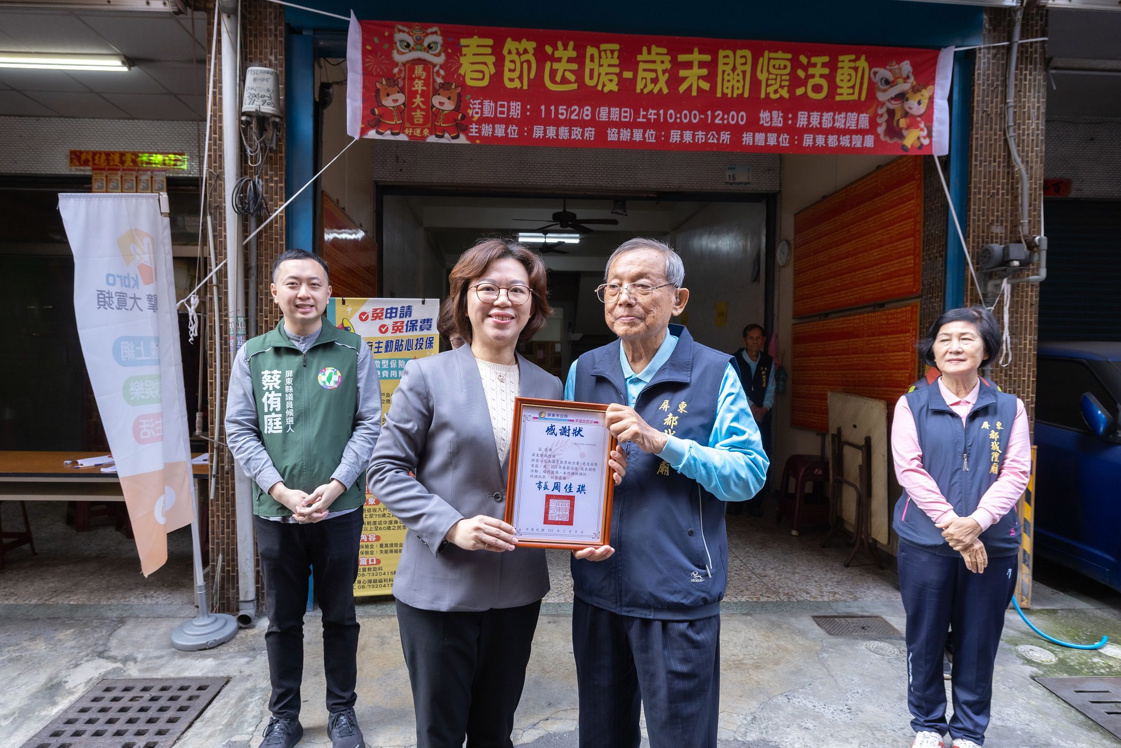 周佳琪市長與社會處長劉美淑到場關懷,並感謝屏東市聖帝廟慈鳳宮董事長陳沈碧蓮、玉皇宮主委陳懿惠、都城隍廟主委王家銘及眾多志工的熱情付出。周市長表示,「春節送暖.歲末關懷活動」已連續舉辦14年,不僅提供實質協助,更象徵地方長期累積的愛心與溫情,讓弱勢家庭在寒冬中也能安心過好年。